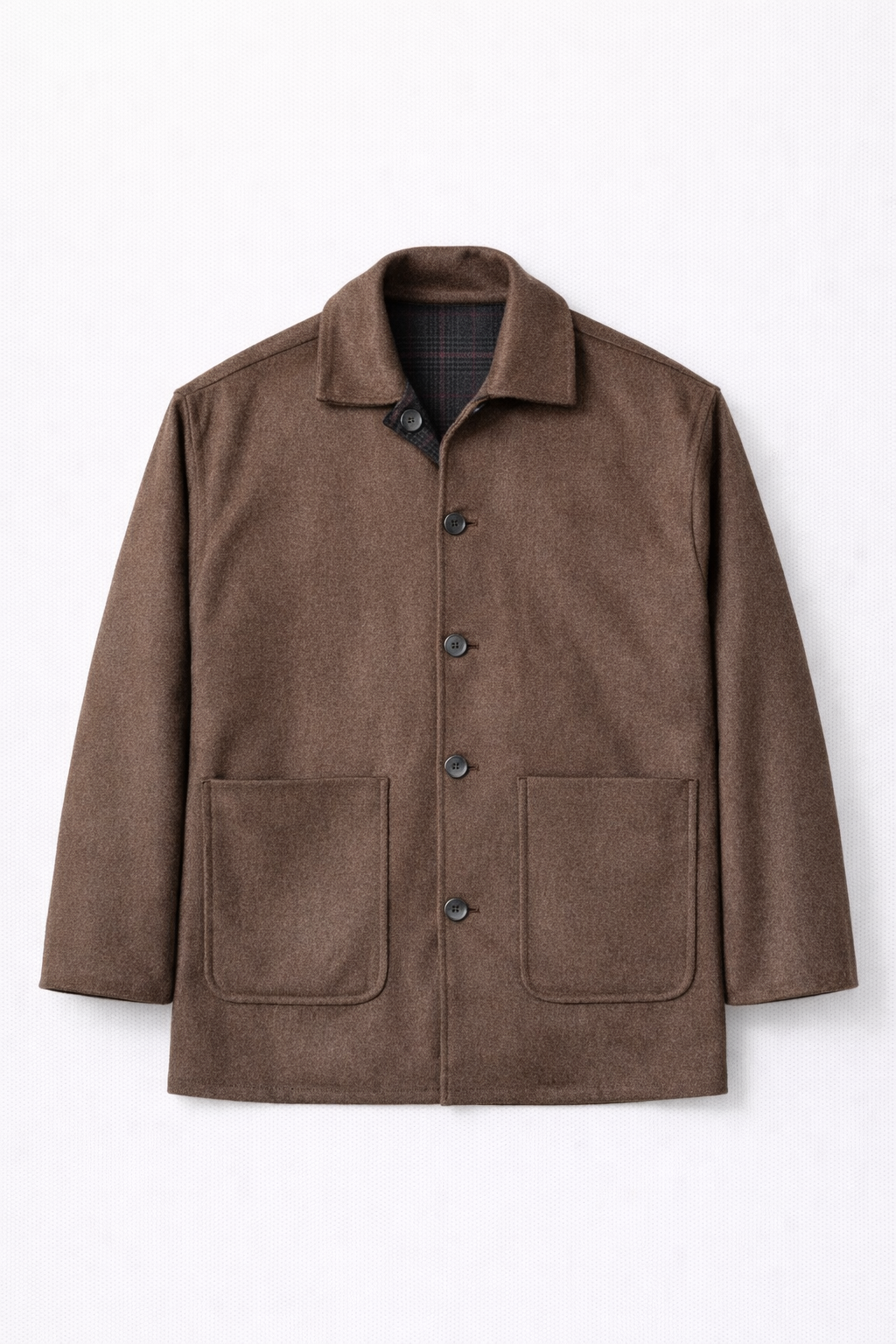 Brun Réversible е олицетворение на съвременната функционалност с ретро полъх – класическо палто с прав силует, изработено от висококачествена италианска вълна с идеално балансирана плътност. От едната страна – гладка, минималистична повърхност в топло шоколадово кафяво. От другата – фин тартан в приглушена палитра, който добавя характер и дълбочина.