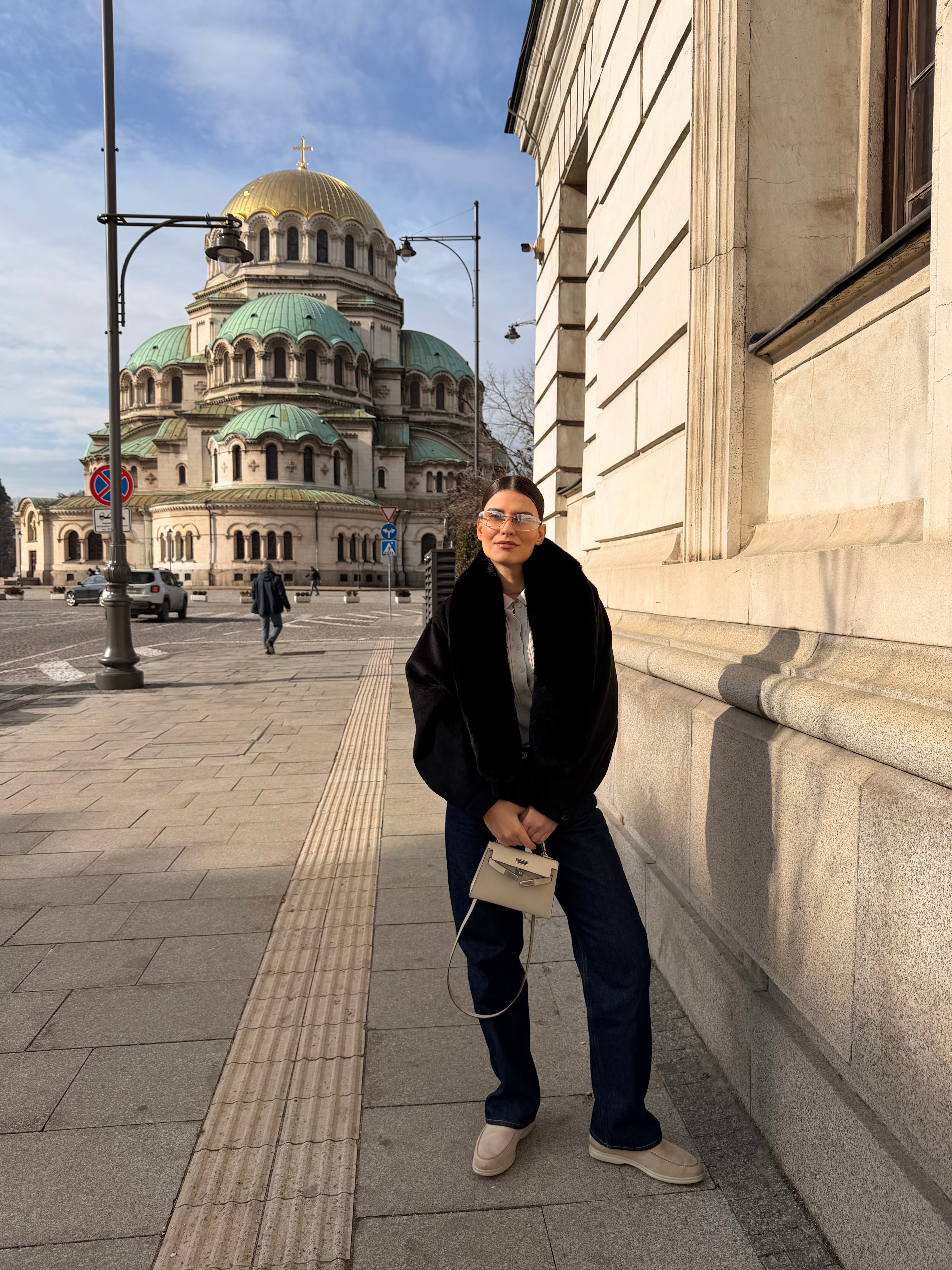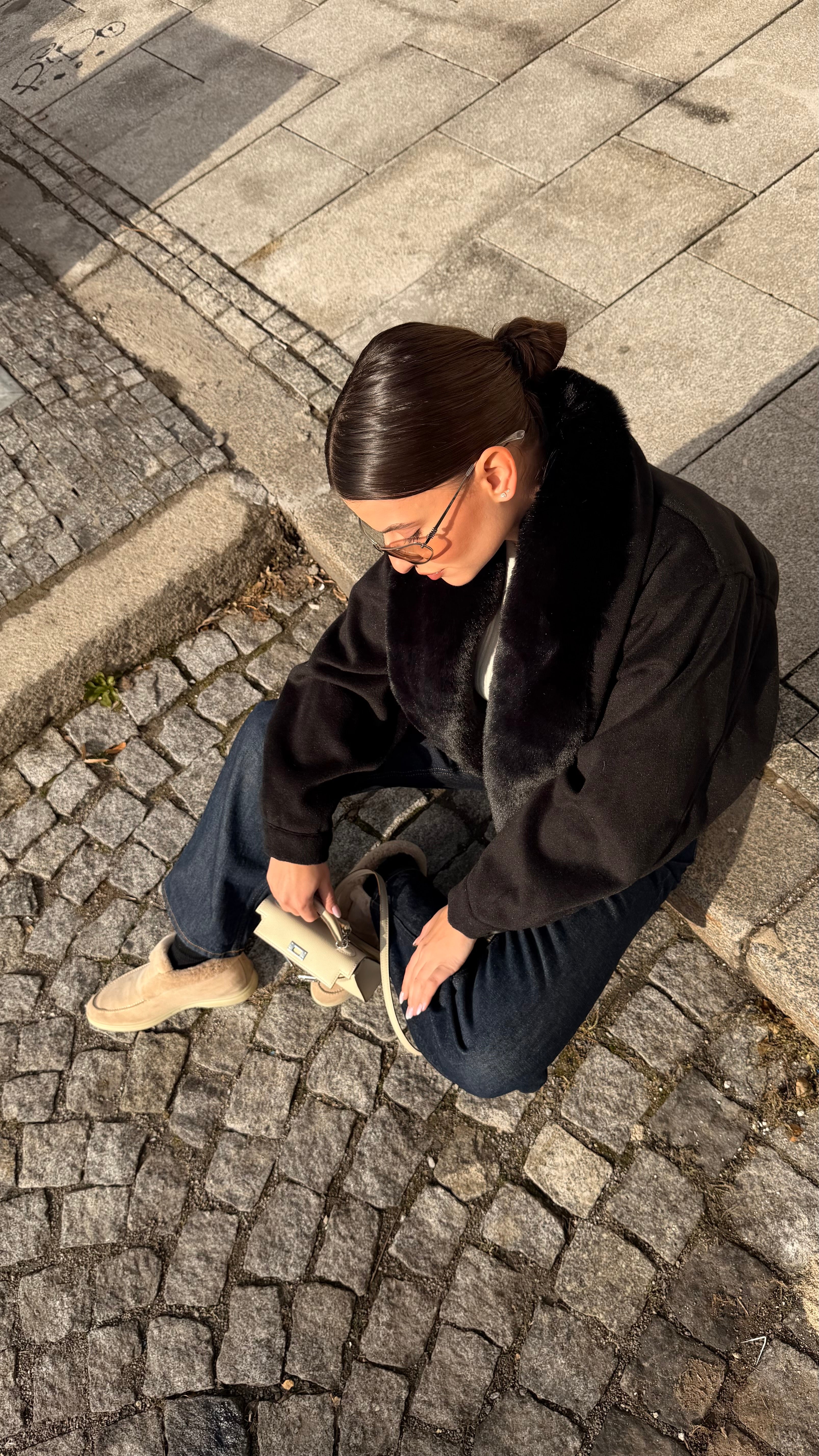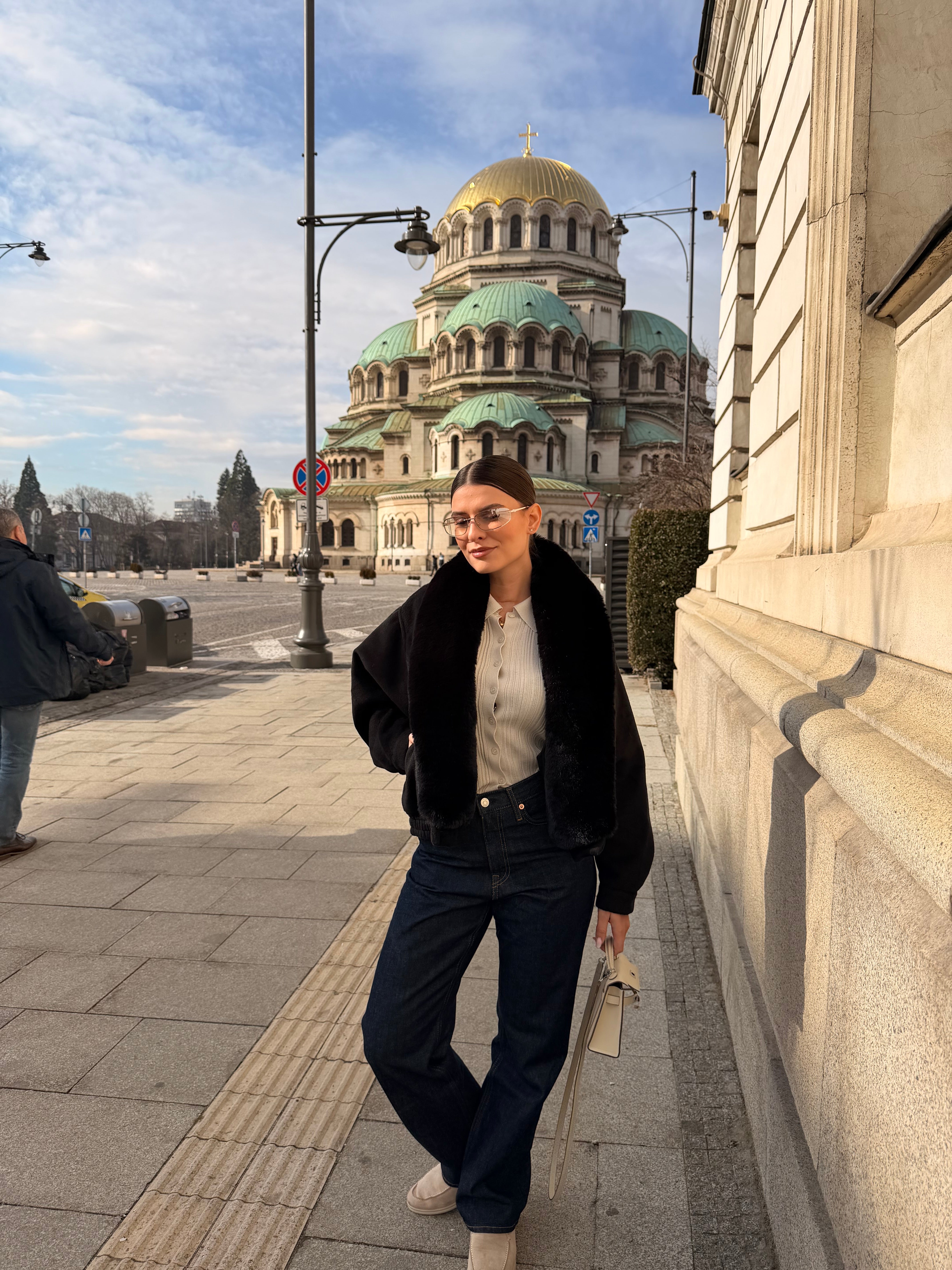 Вдъхновено от елегантността на полунощ, палтото “Minuit en Noir” впечатлява с изчистен силует и богата текстура. Моделът е изработен от висококачествена смес с меко усещане и деликатен блясък, а обемната яка от еко кожа придава лукс и характер. Черният цвят носи усещане за съвременен минимализъм, а късата, леко oversize кройка подчертава градската естетика на визията. “Minuit en Noir” е изявление за уверен стил – едновременно топло, елегантно и модерно. Носи го с дънки, клинове или пък поли - със сигурност ще бъдеш забелязана