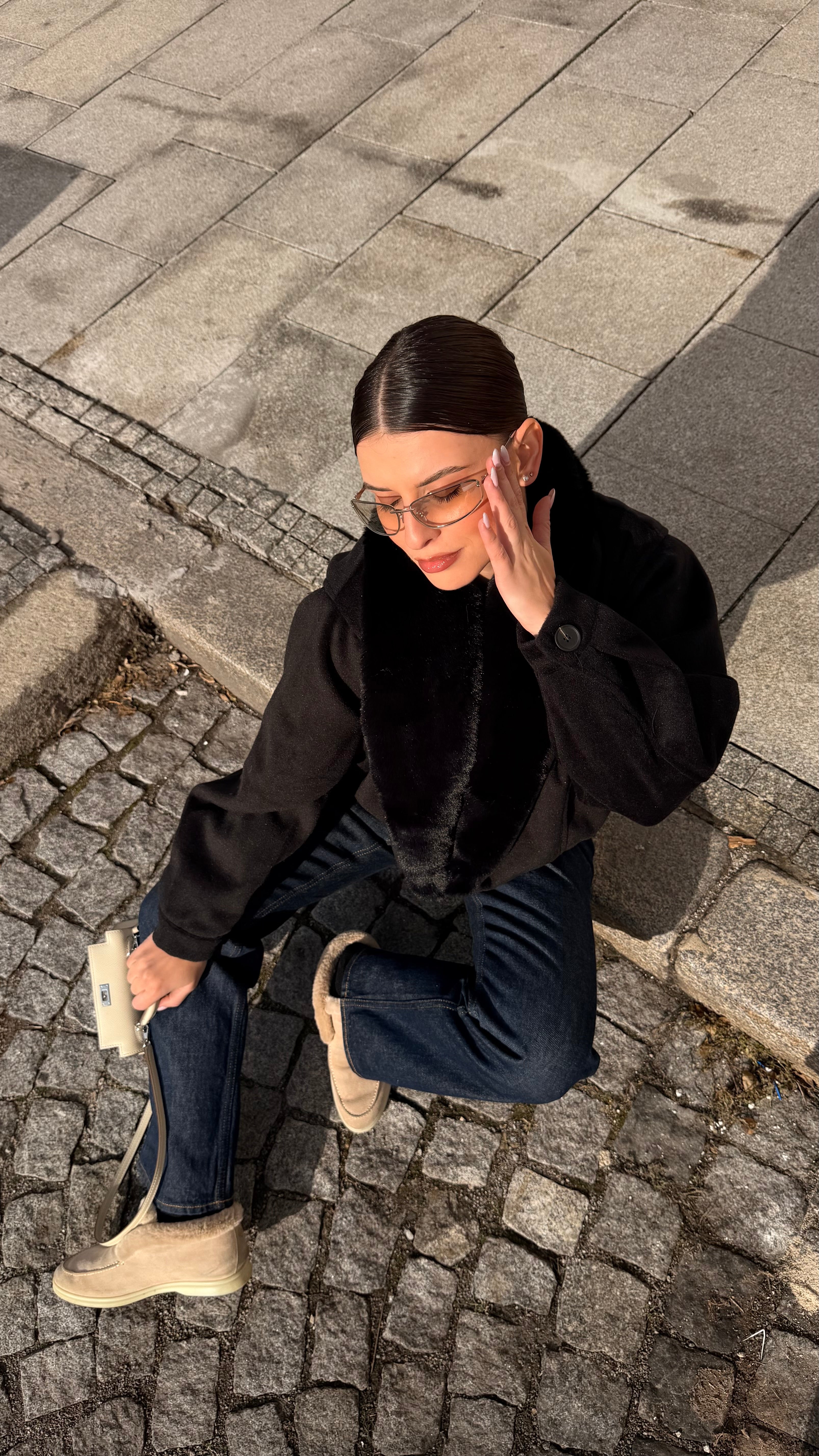 Палто “Minuit en Noir” – късо палто в черно с обемна яка от еко кожа