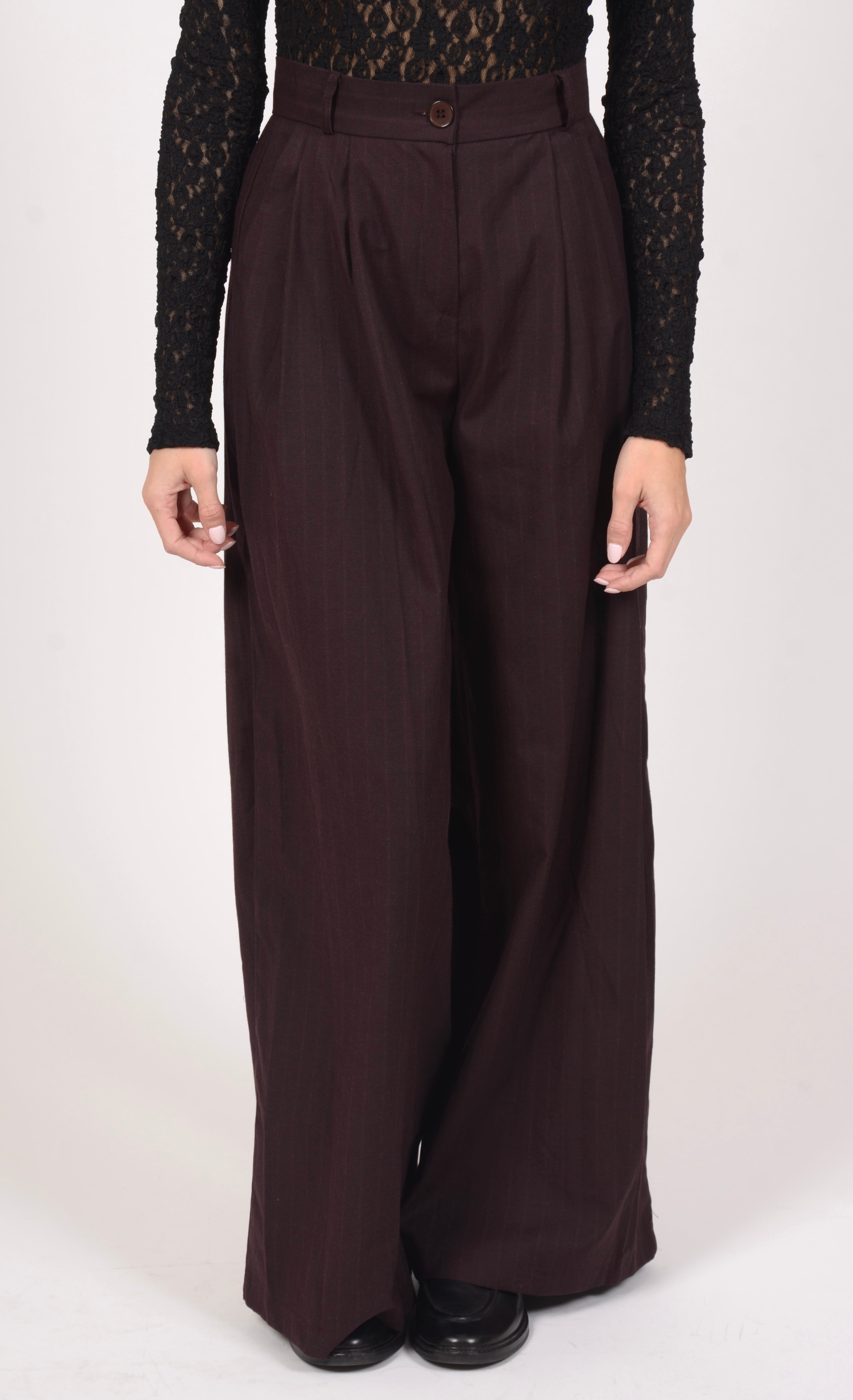 Елегантен панталон с висока талия и широк крачол в цвят патладжан на фино райе, изработен от памук с фина текстура. Плисетата отпред подчертават линията и придават лек обем, а коланът с копче оформя талията. Перфектен избор за офиса или за ежедневно облекло – носи с риза, дантелен топ или любимото си сако.