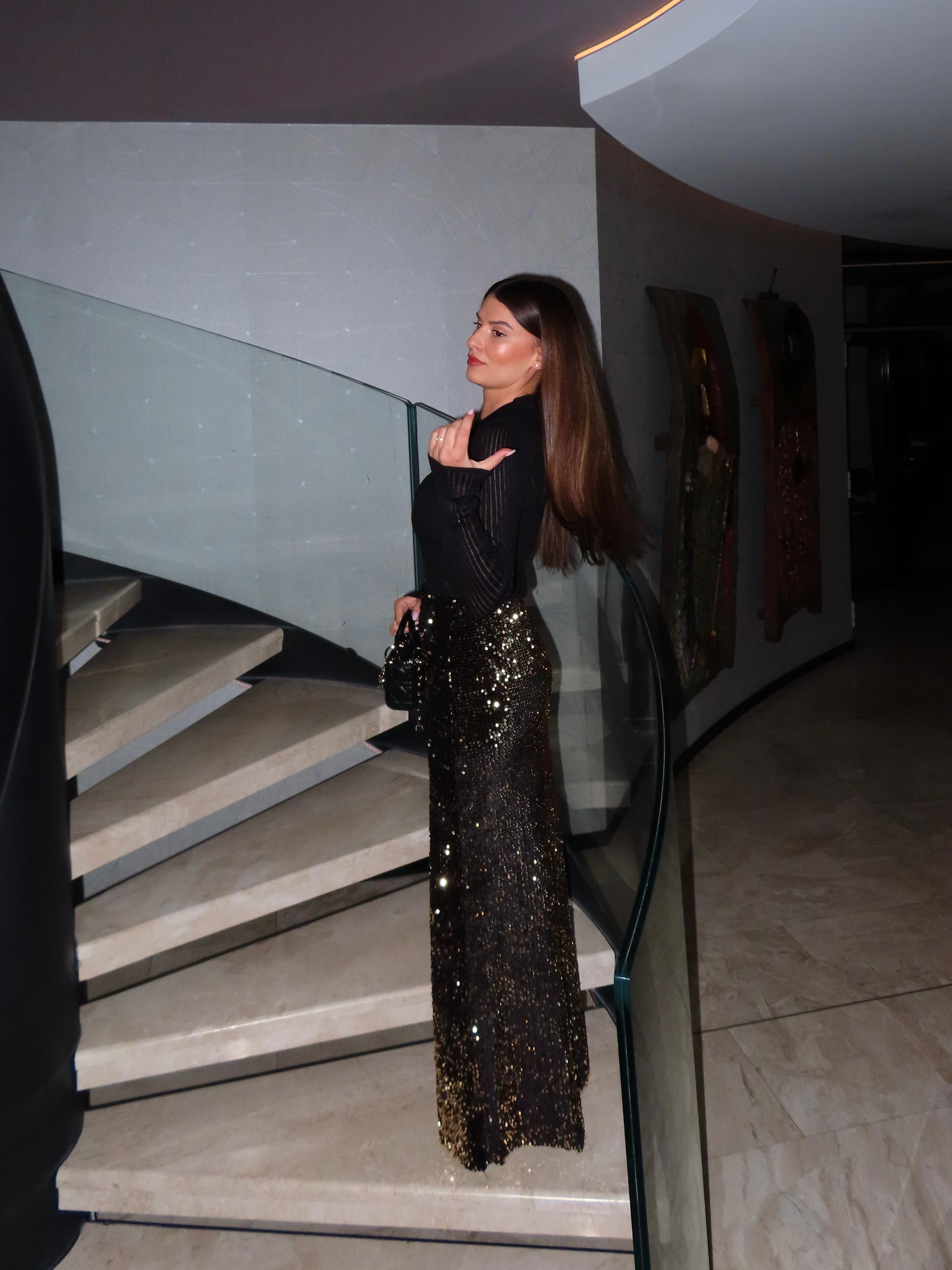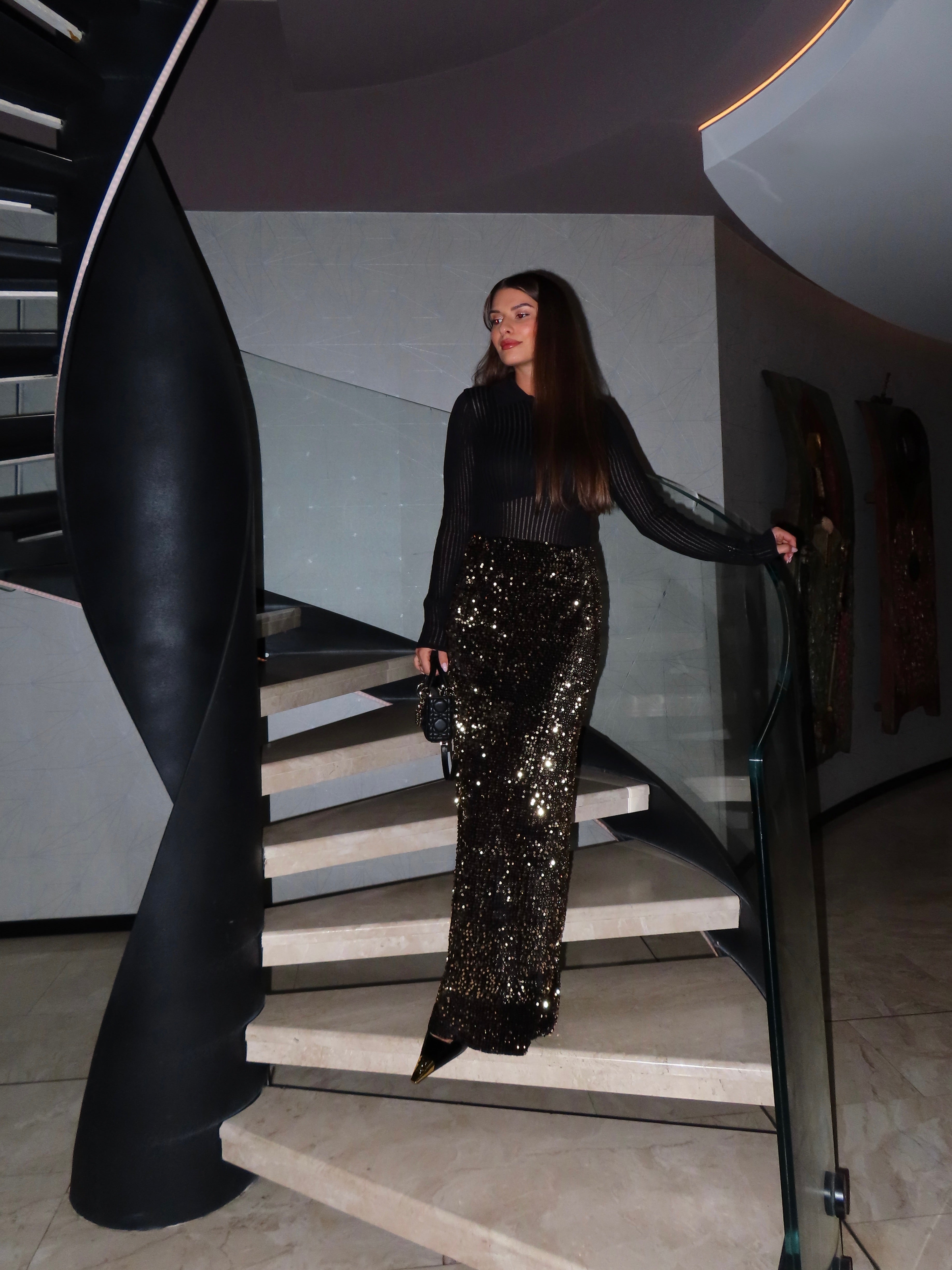 Velours de Minuit е вечерна пола, създадена да озари нощта. Изработена от богато черно кадифе и ръчно нашити златисти пайети, тя прелива с всеки твой жест и улавя светлината с разточителен блясък.