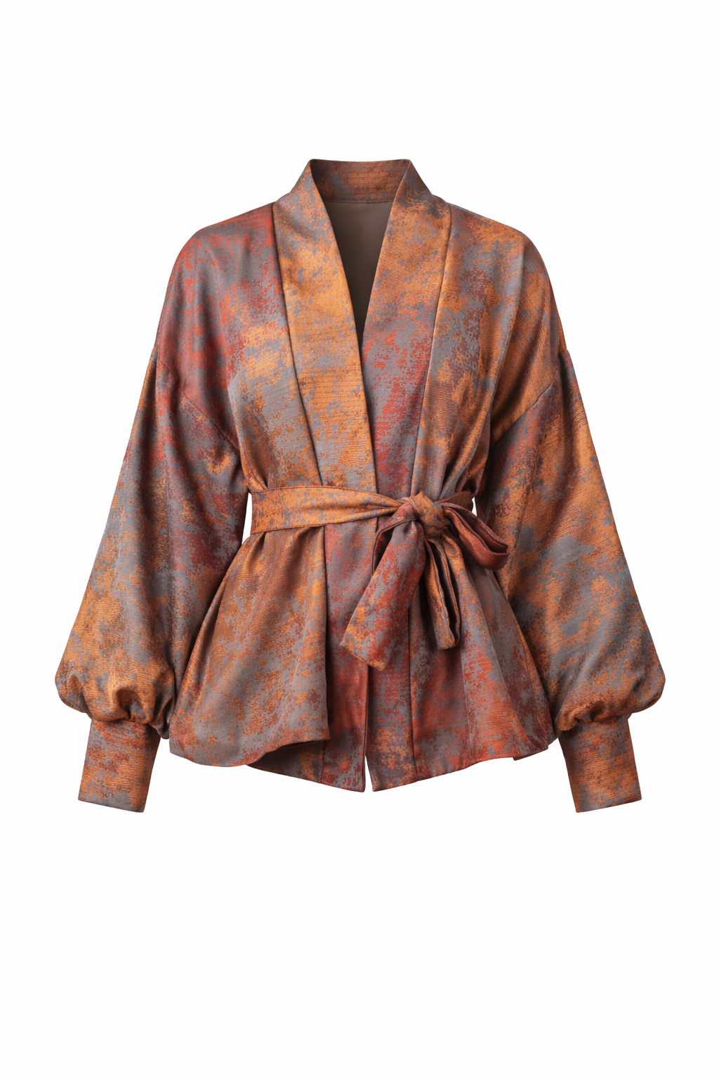 Удобно и стилно яке с колан, идеално за пролетно-летните дни. Плата е релефен и с много красив промазан десен в сиво, червено, оранжево, бордо и бежово. Ръкавите са широки и завършват стеснени. Подходящо за ежедневни визии с красивите си цветове няма как да останете незабелязани.