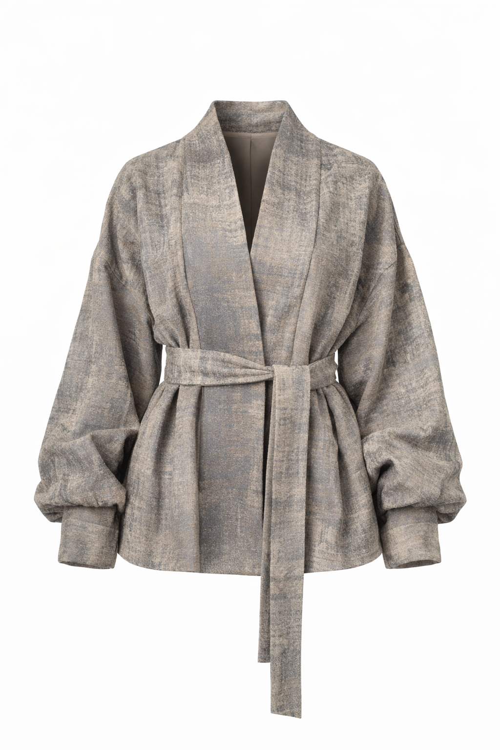 Удобно и стилно яке/палто с колан, идеално за пролетно-летните дни. Платът е релефен и с много красив промазан десен в сиво, бяло и бежово. Ръкавите са широки и завършват стеснени. Подходящо за ежедневни визии с красивите си цветове няма как да останете незабелязани.
