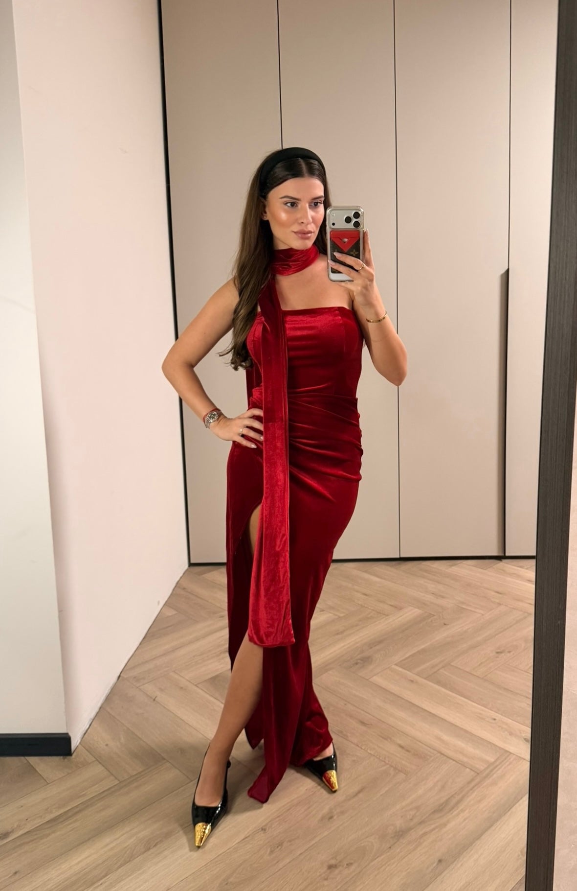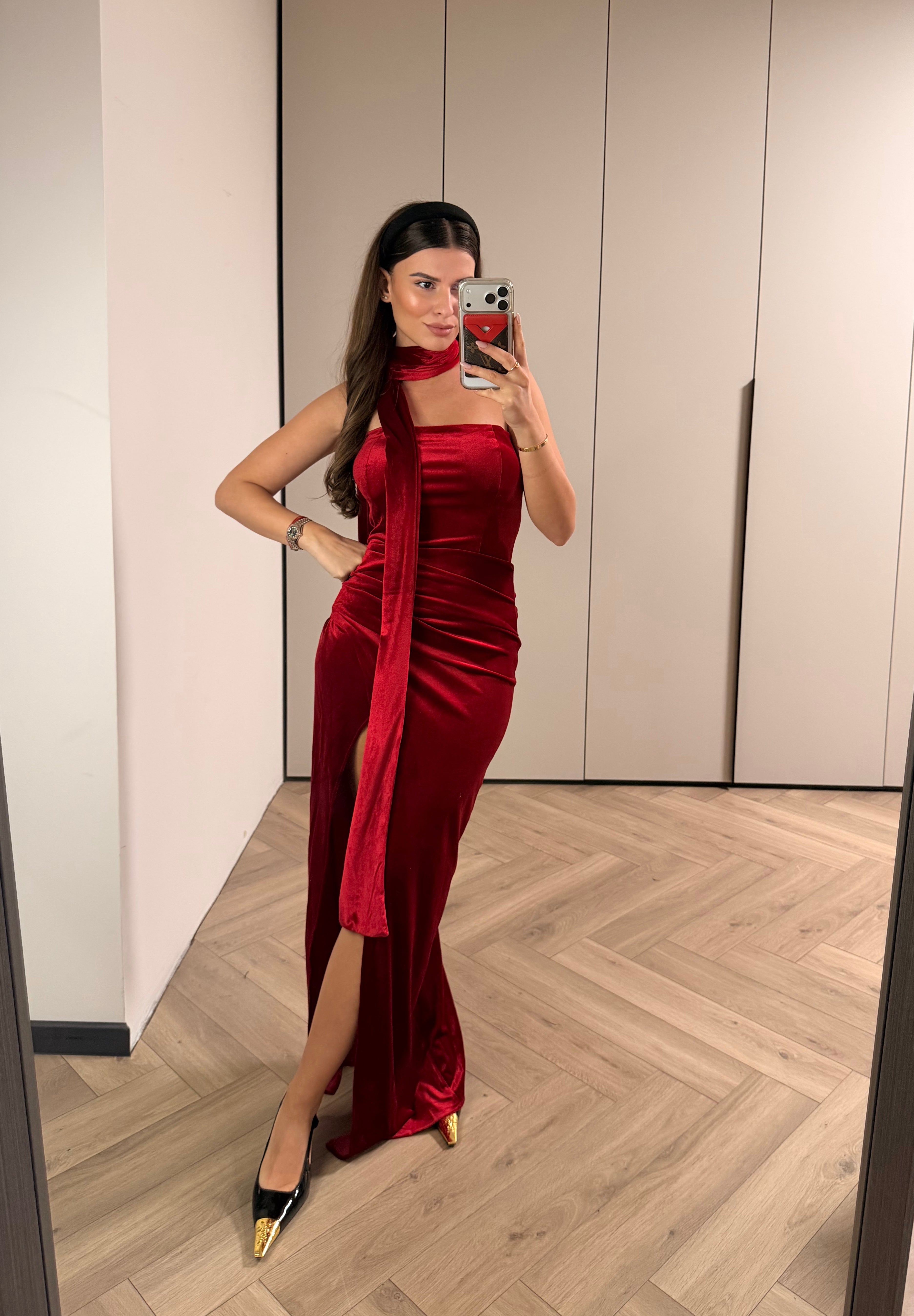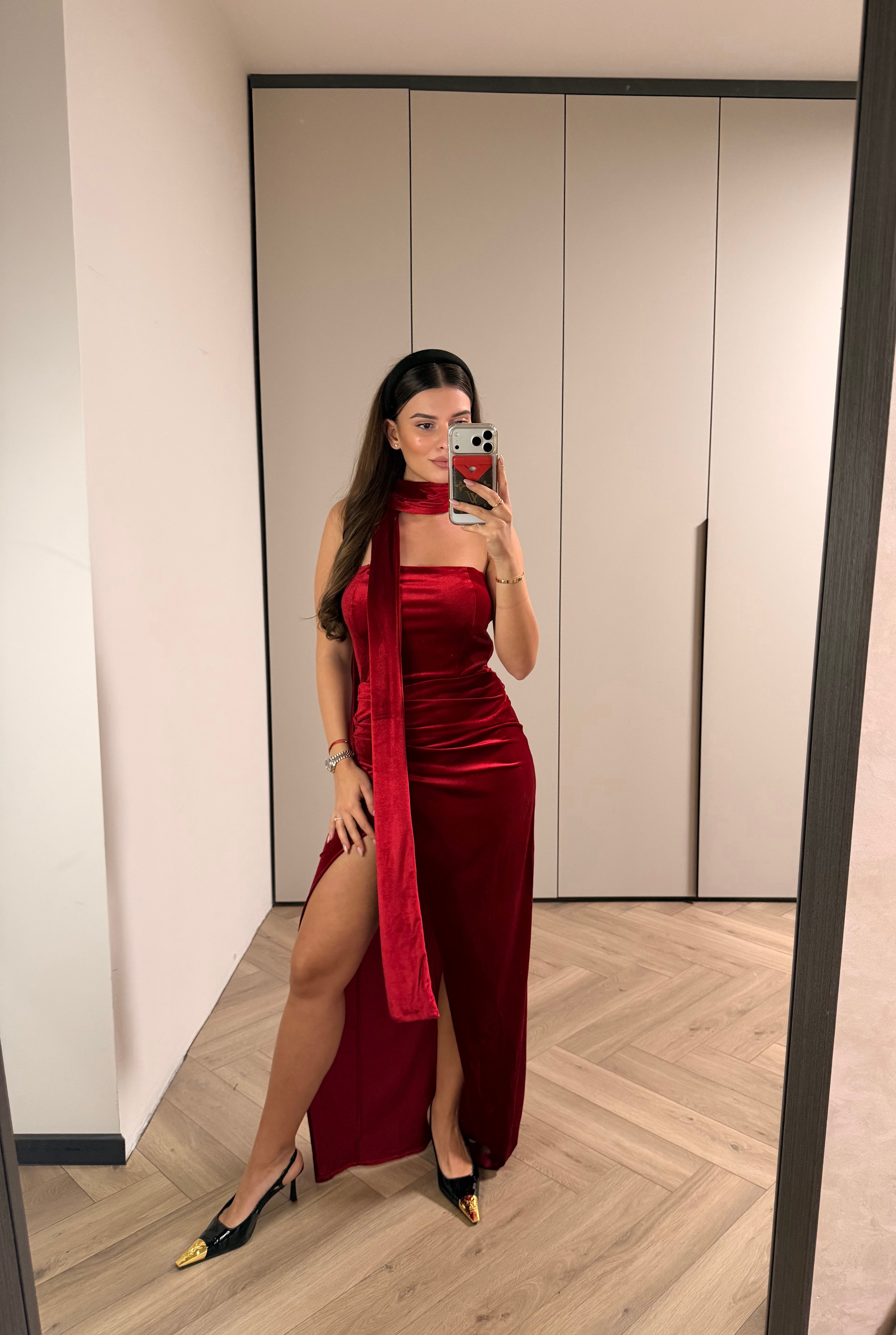 Dîner à l’Atelierе рокля, която пренася усещането за haute couture в реалността – силует, създаден да впечатлява, изваяни линии и червено, което разказва история. Горното корсетно оформление с вградени чашки подчертава бюста, а кадифената материя обгръща тялото в мек блясък.