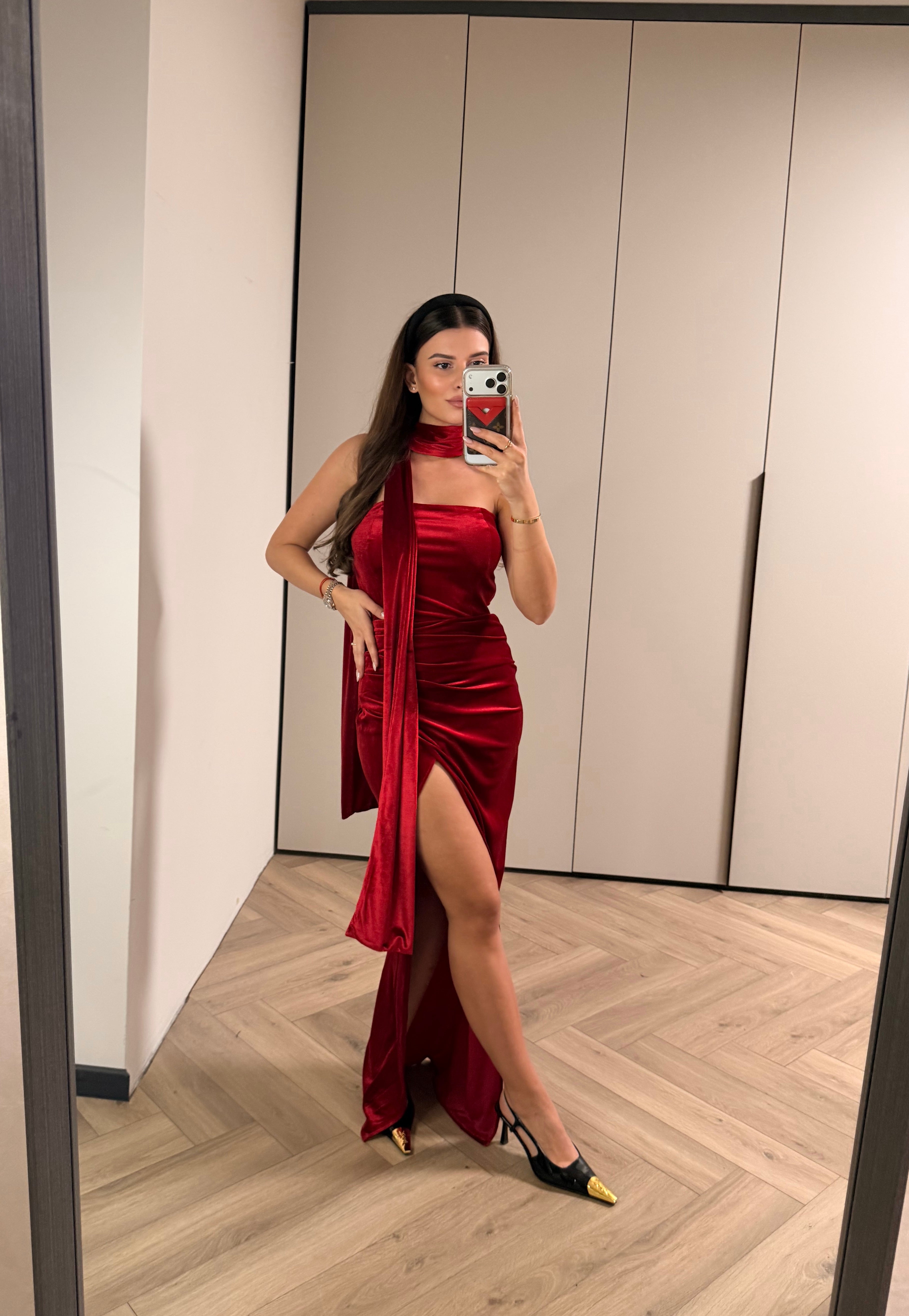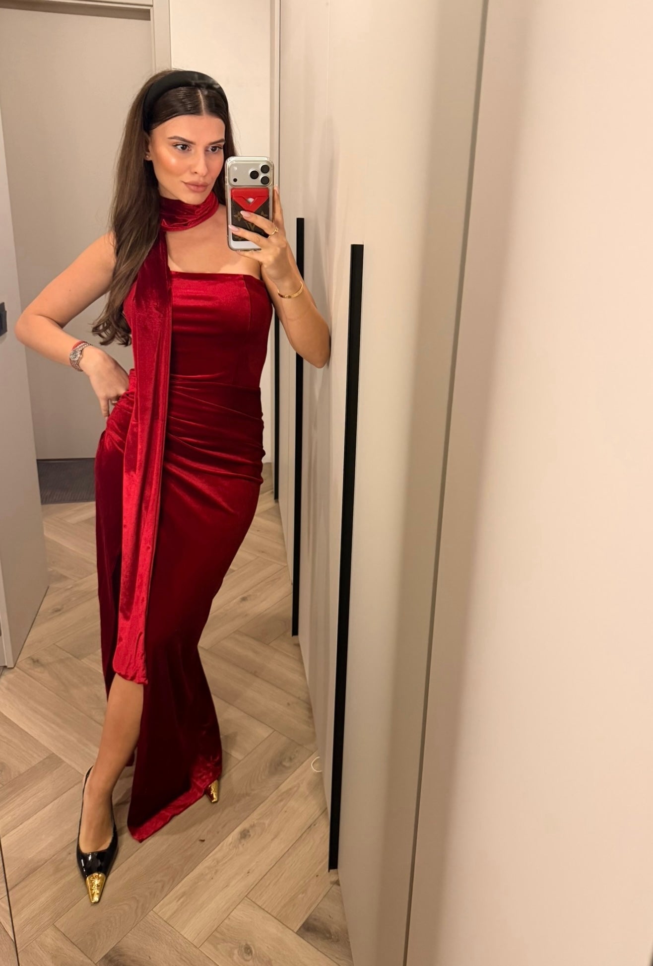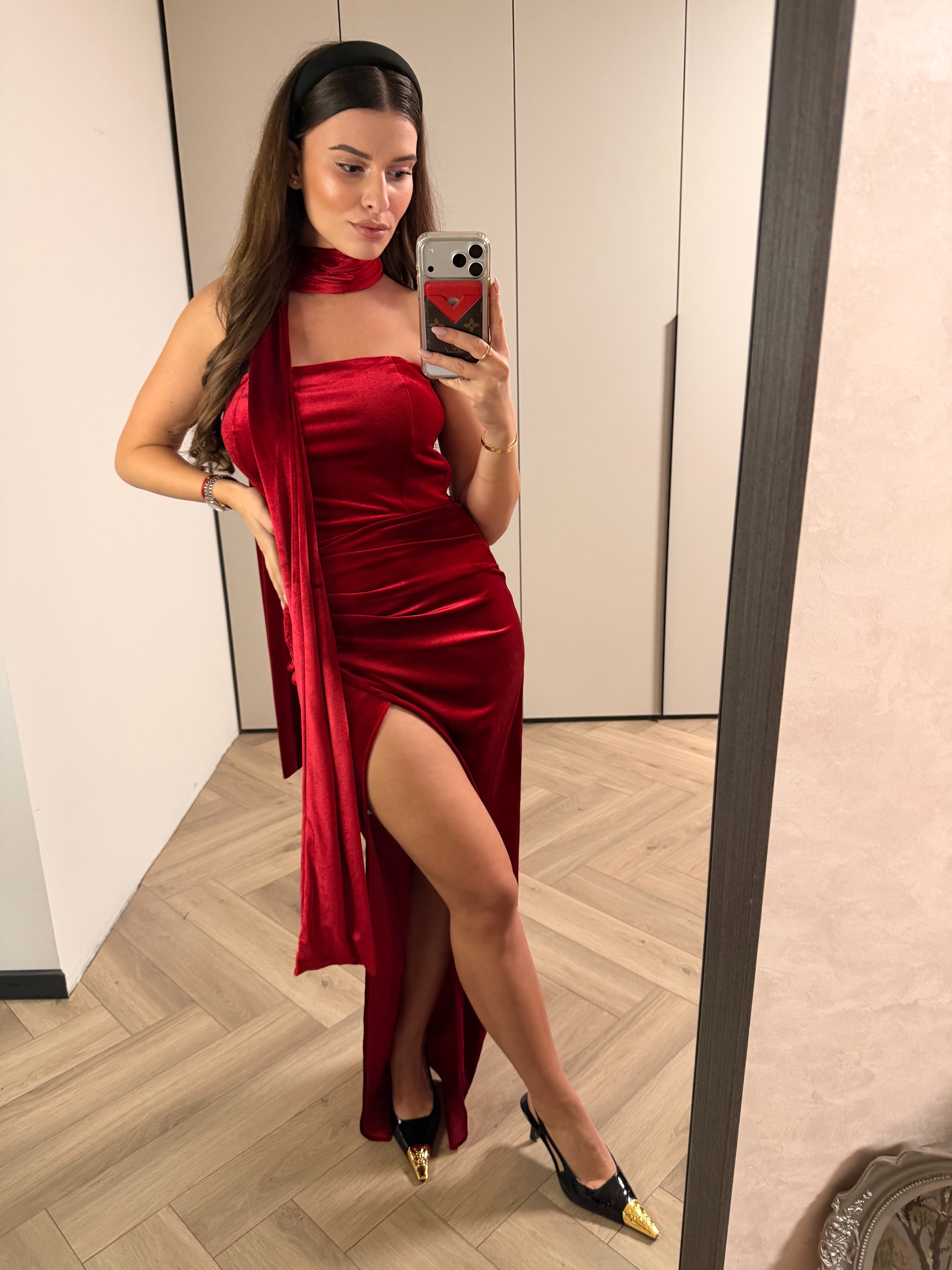 Dîner à l’Atelierе рокля, която пренася усещането за haute couture в реалността – силует, създаден да впечатлява, изваяни линии и червено, което разказва история. Горното корсетно оформление с вградени чашки подчертава бюста, а кадифената материя обгръща тялото в мек блясък.
