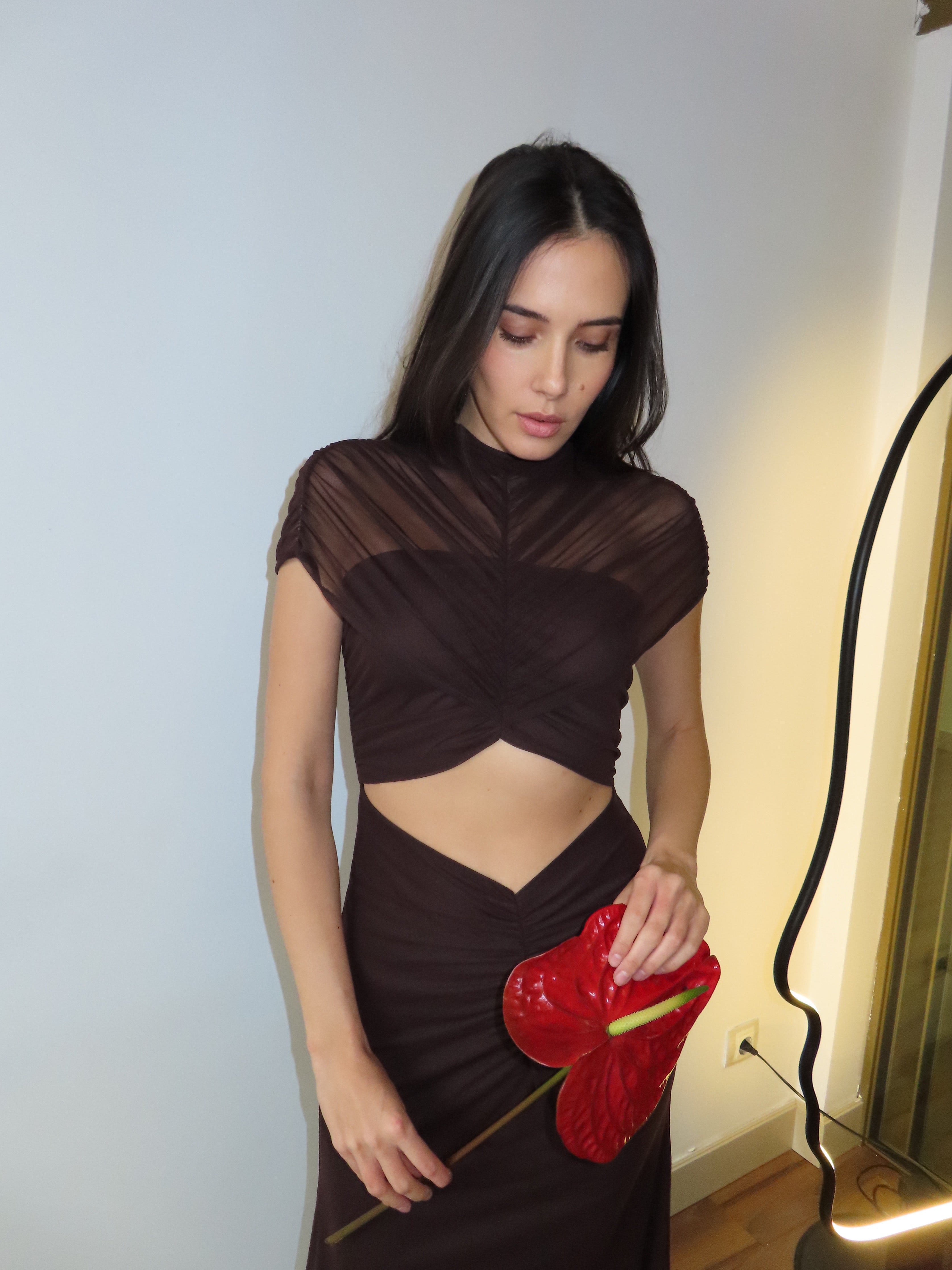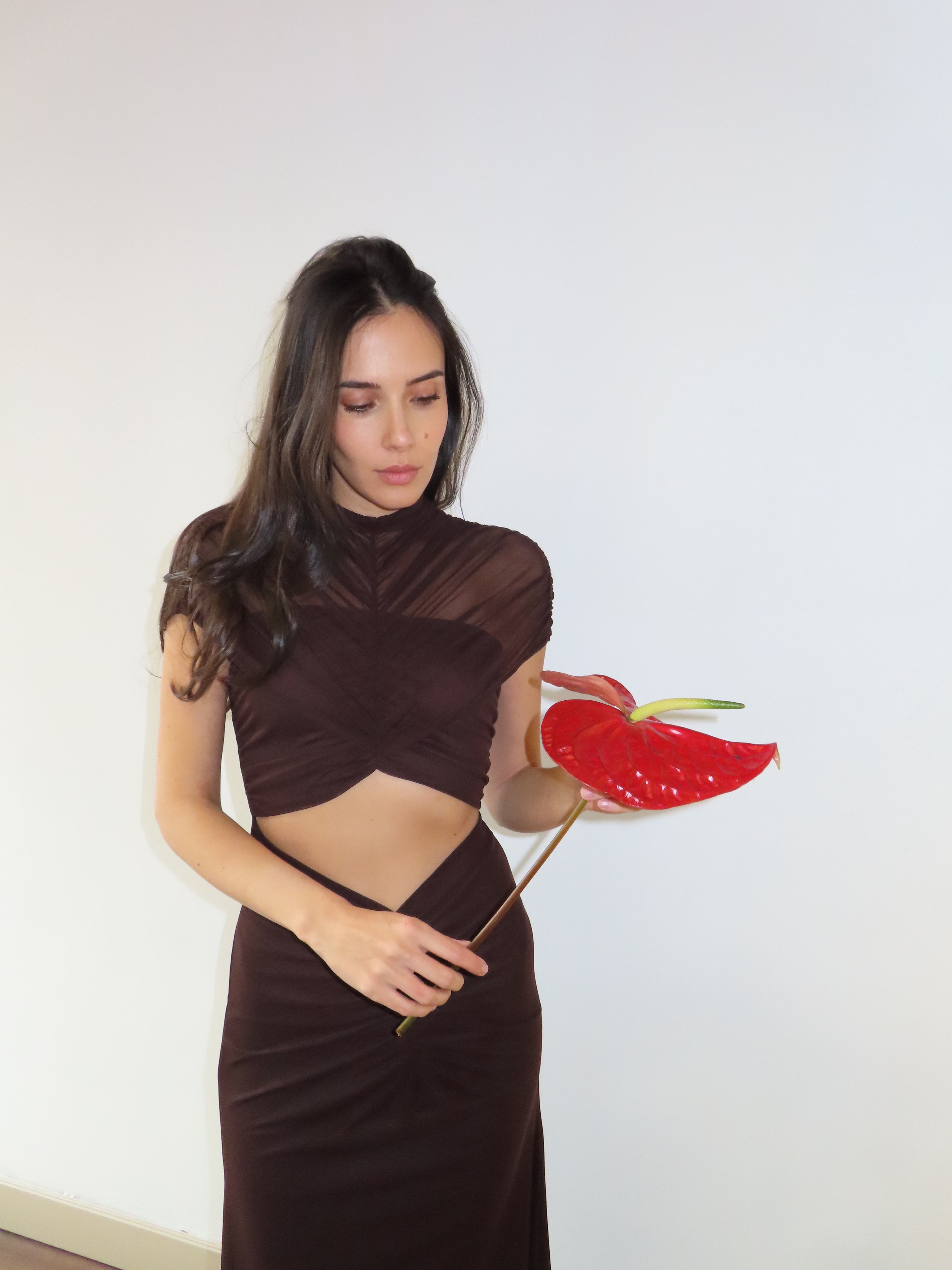 Muse 26 е рокля, която излъчва дръзка женственост и модерна чувственост с високо модно присъствие. Дълбокият шоколадов нюанс придава топлина и лукс, създавайки изключително елегантна и запомняща се визия.