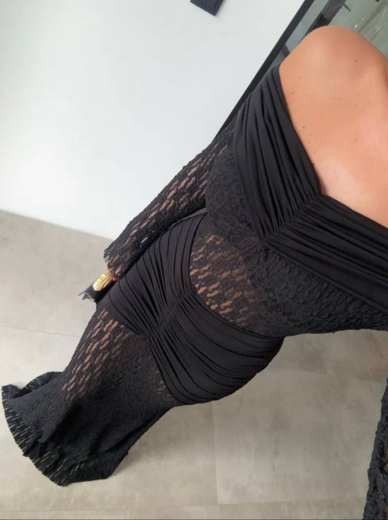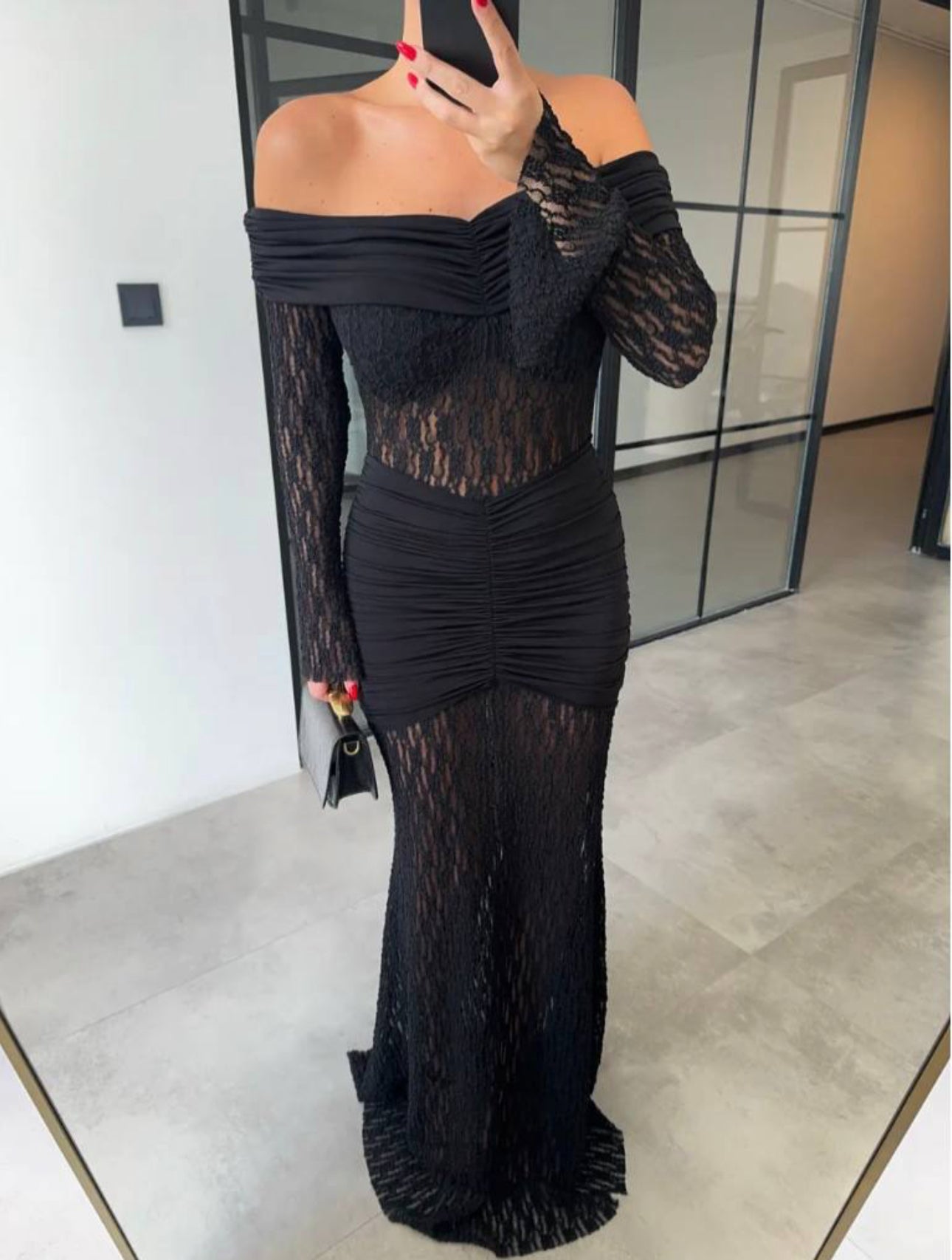 Дълга рокля с голи рамене в  черно, изработена от деликатна дантела с полупрозрачен ефект. Горната част има ефектни набирания, които подчертават силуета и деликатна подплата, покриваща бюста. Долната част е елегантно падаща и разкроена с прозрачни детайли, които придават мистериозен и чувствен акцент. В средната част дантелата е покрита с красив плат, имитиращ пола, който има ефектни набори. Перфектна за вечерни събития и специални поводи, тази рокля съчетава драматичност и изисканост в едно.