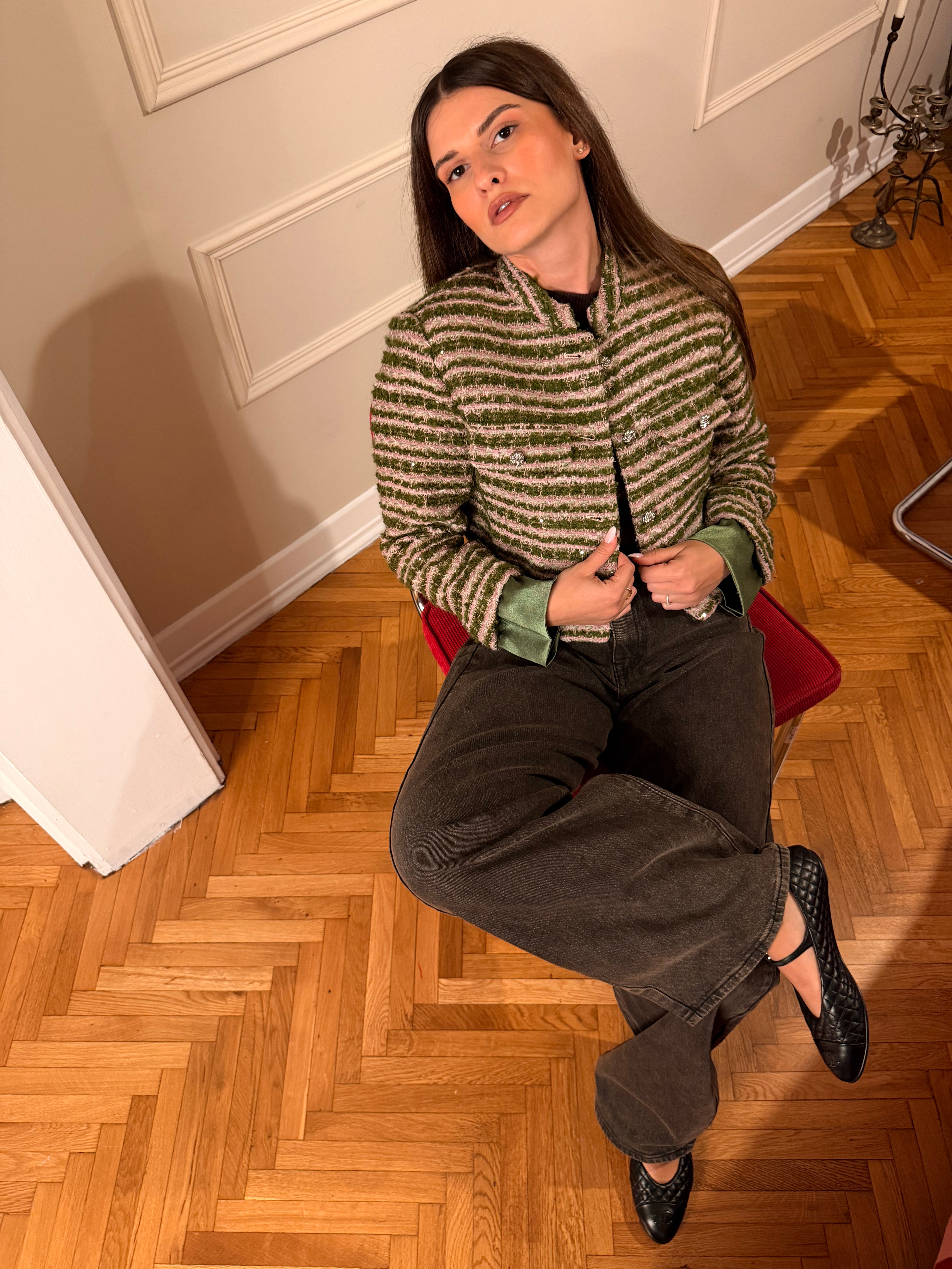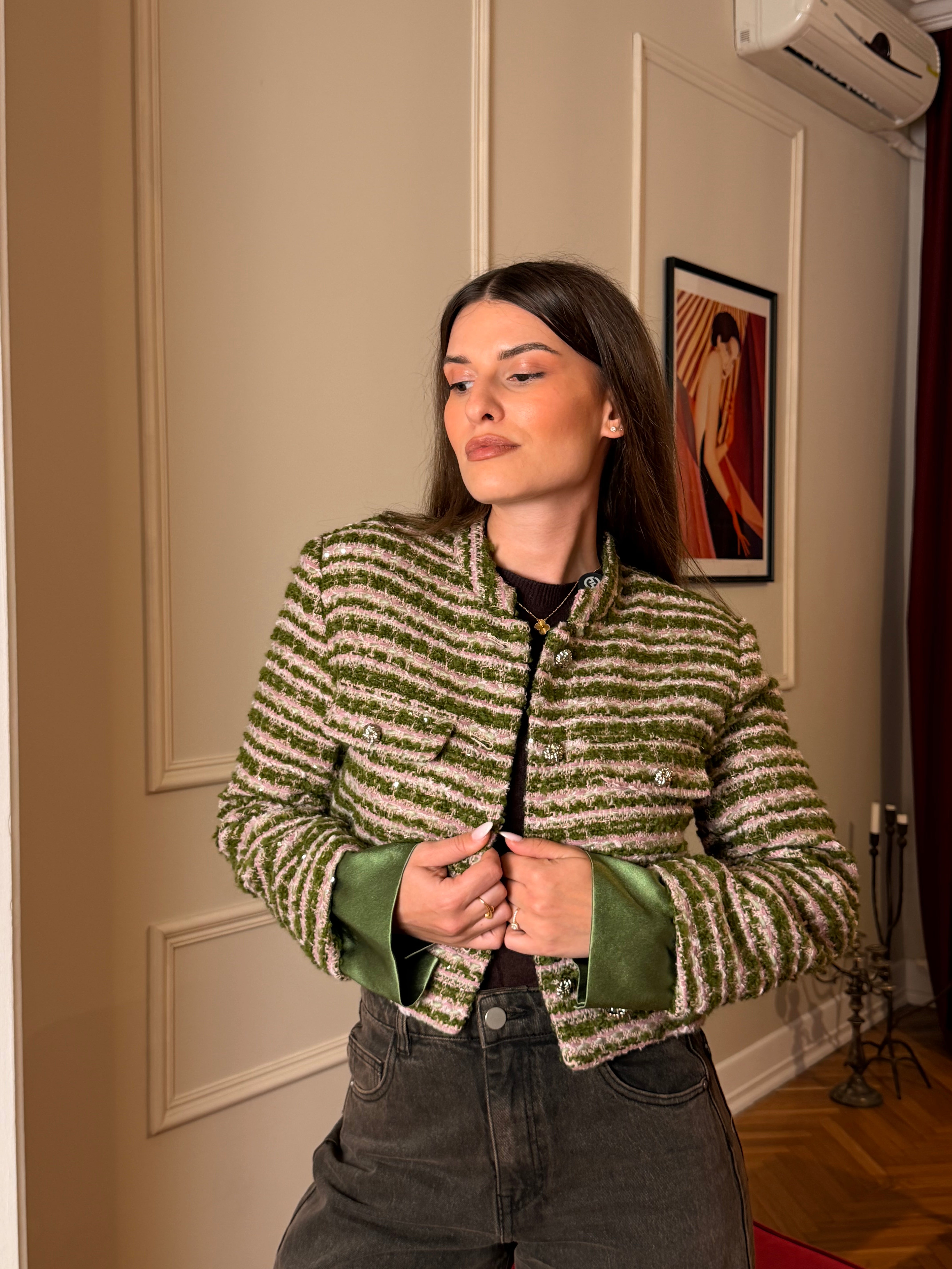 Опресняване на наличносттаСако “Jardin Lumière” – късо сако в зелено, бяло и розово с деликатни пайети и сатенени ръкави