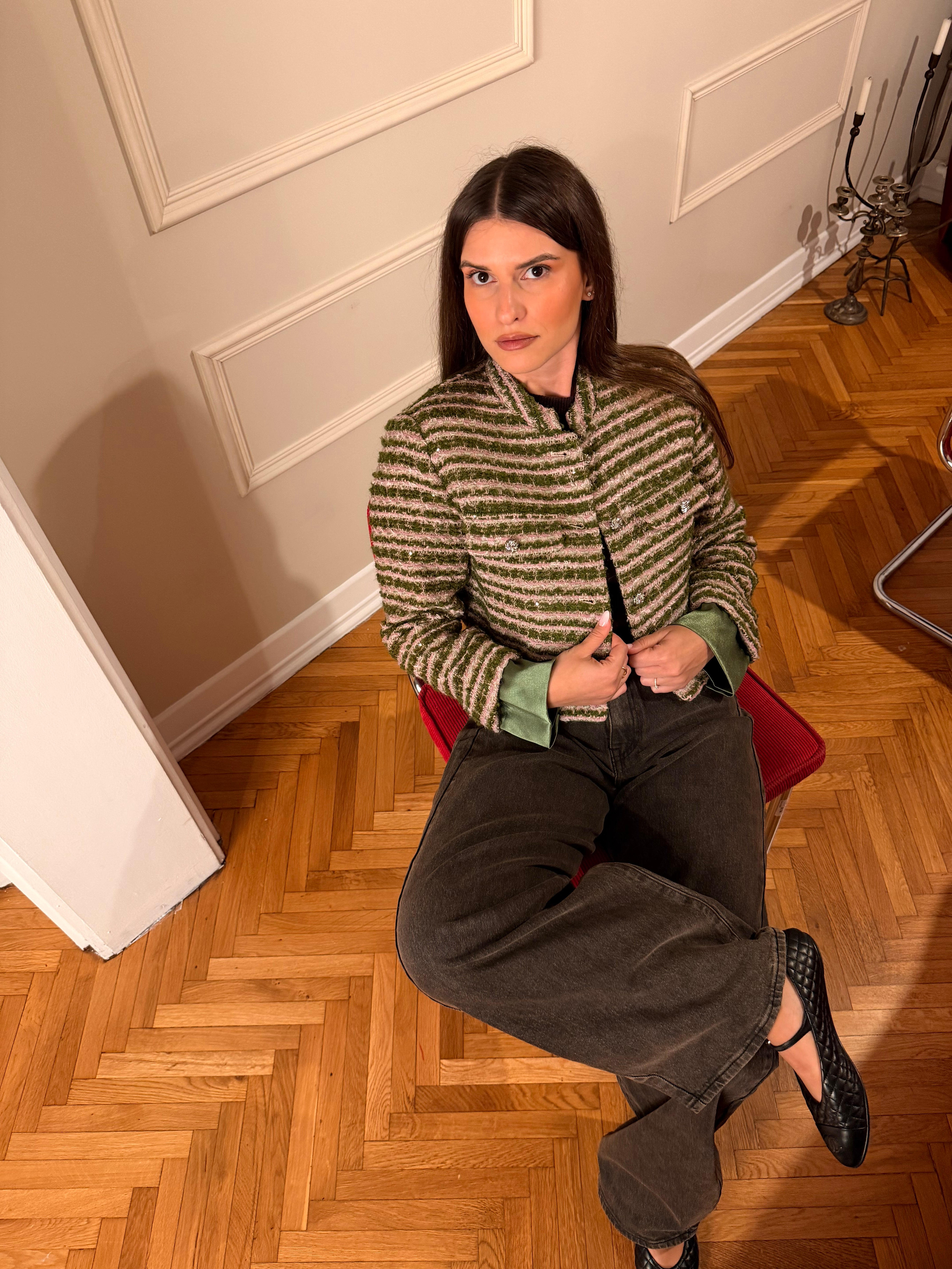 Металните копчета завършват визията с бижу-детайл — малък, но ключов акцент, който подсилва луксозното излъчване на модела. Кройката е къса и структурирана, идеална за подчертаване на талията и комбиниране както с деним, така и с по-елегантни долнища.