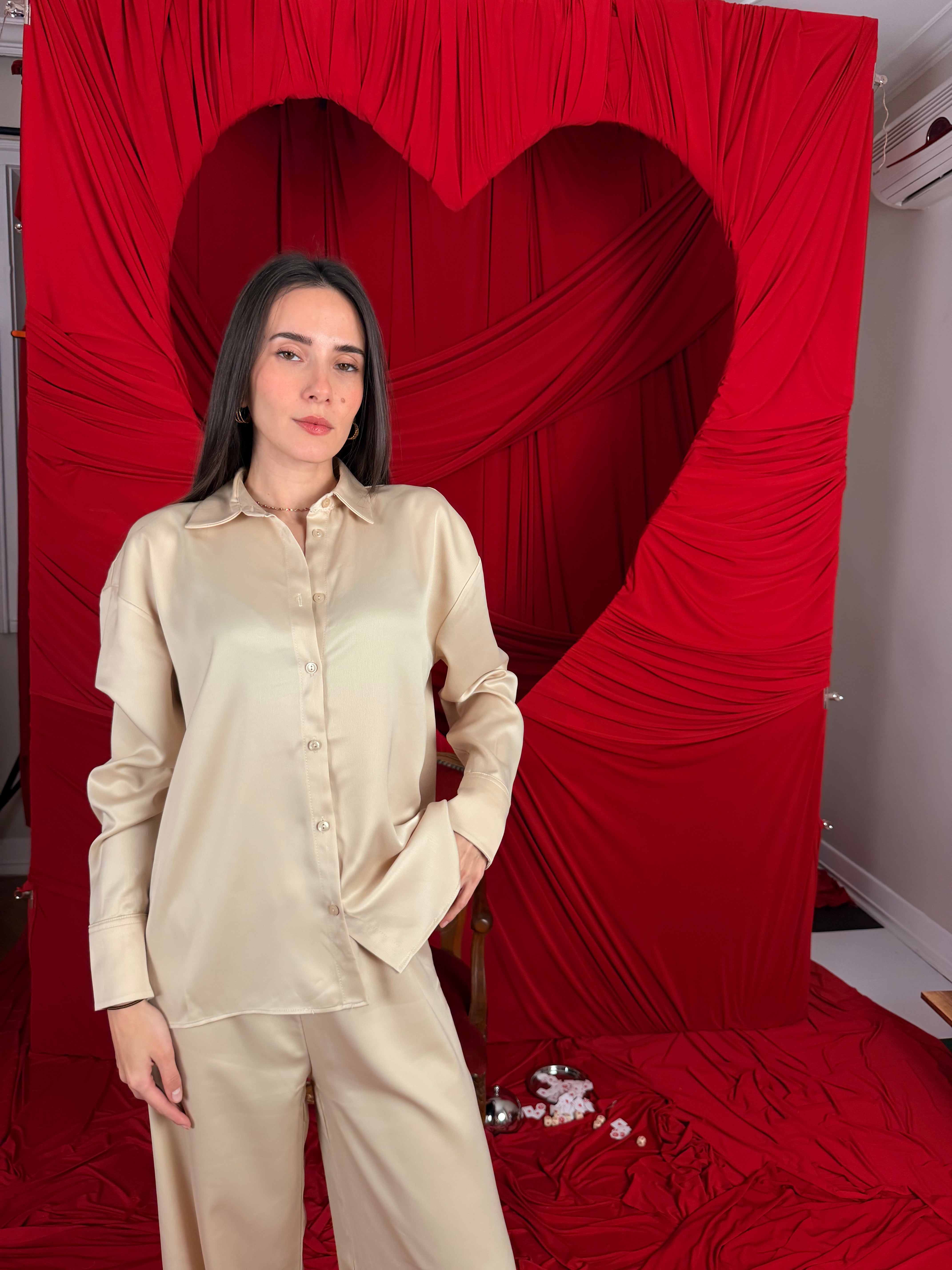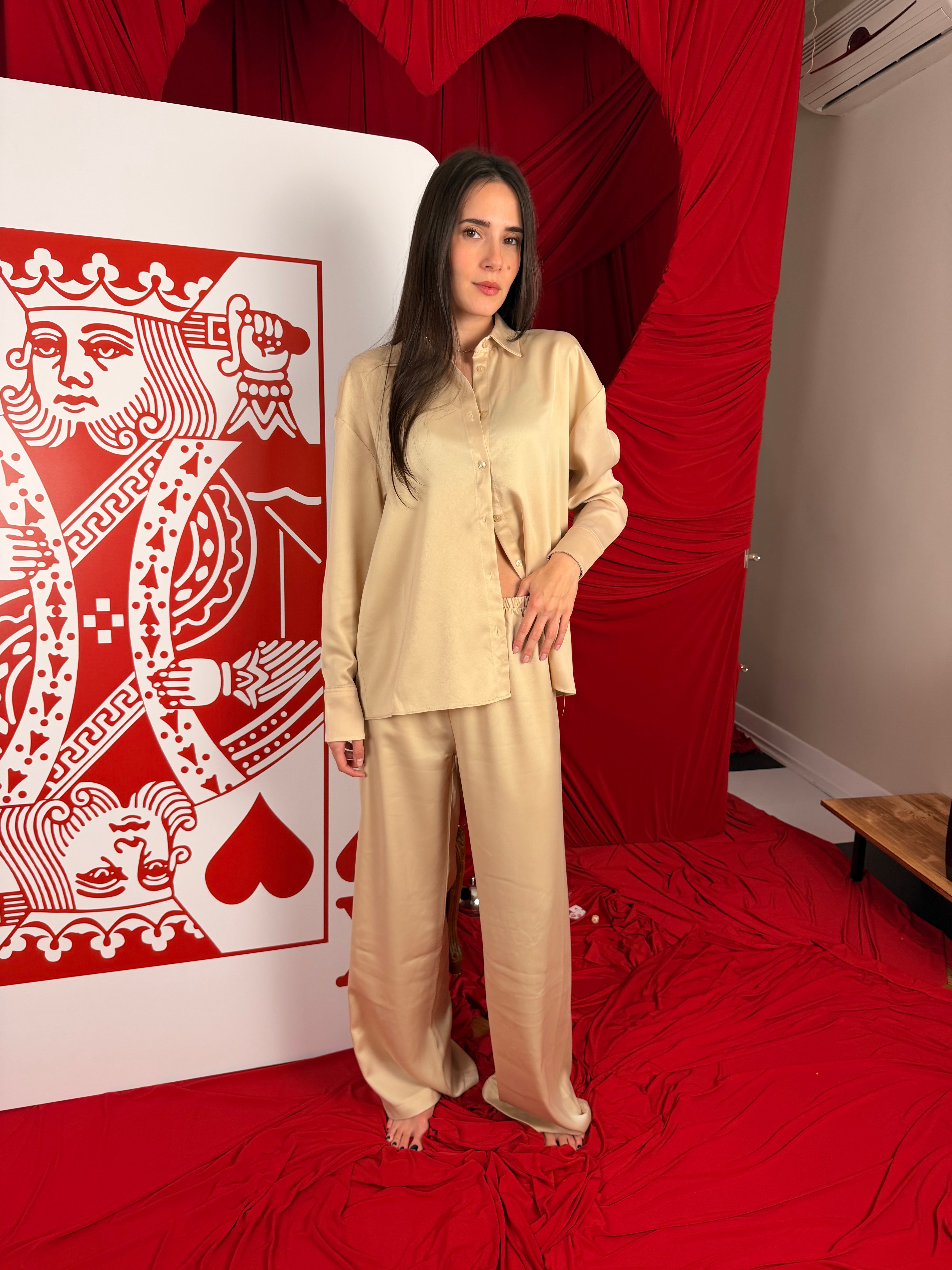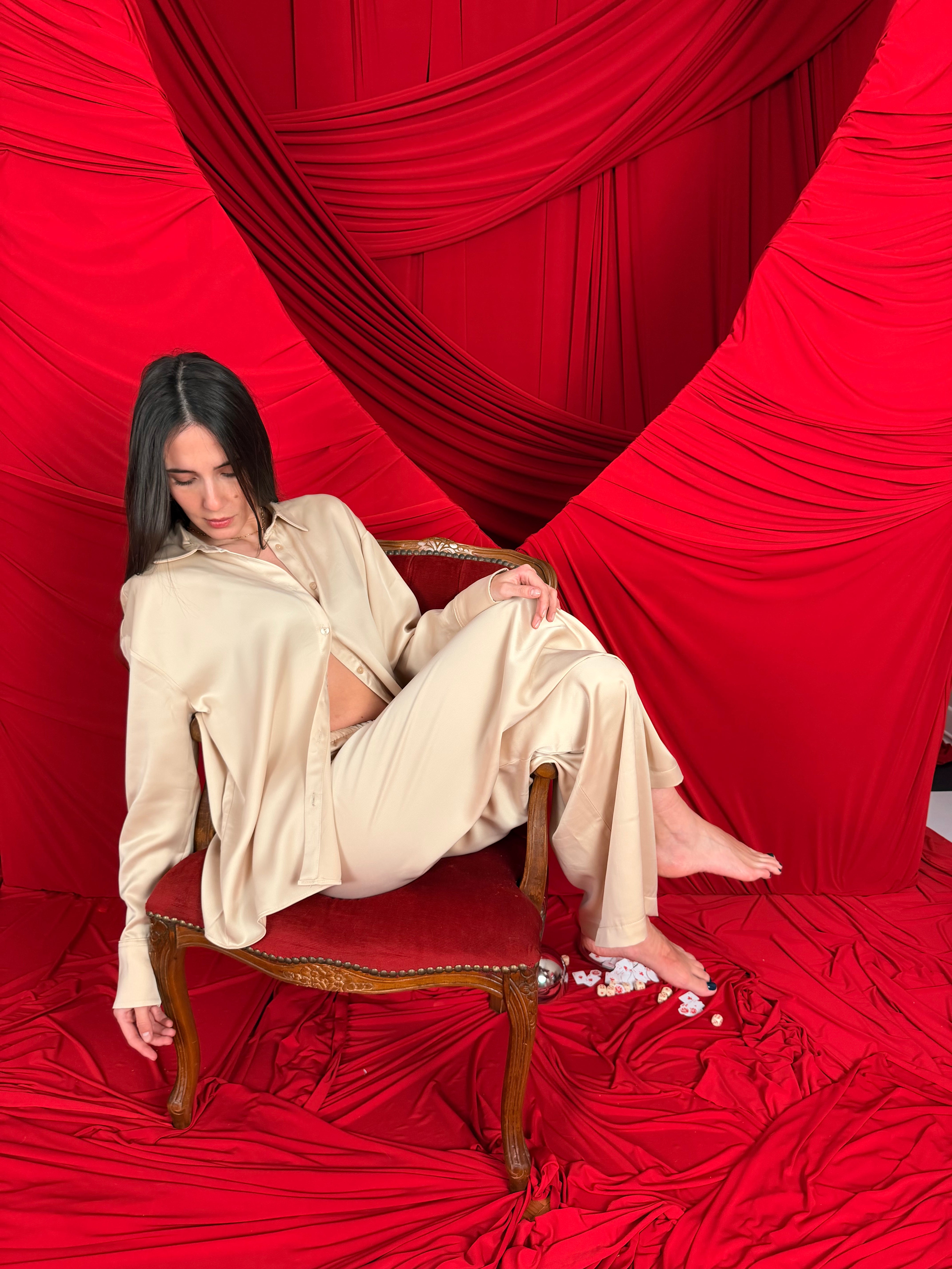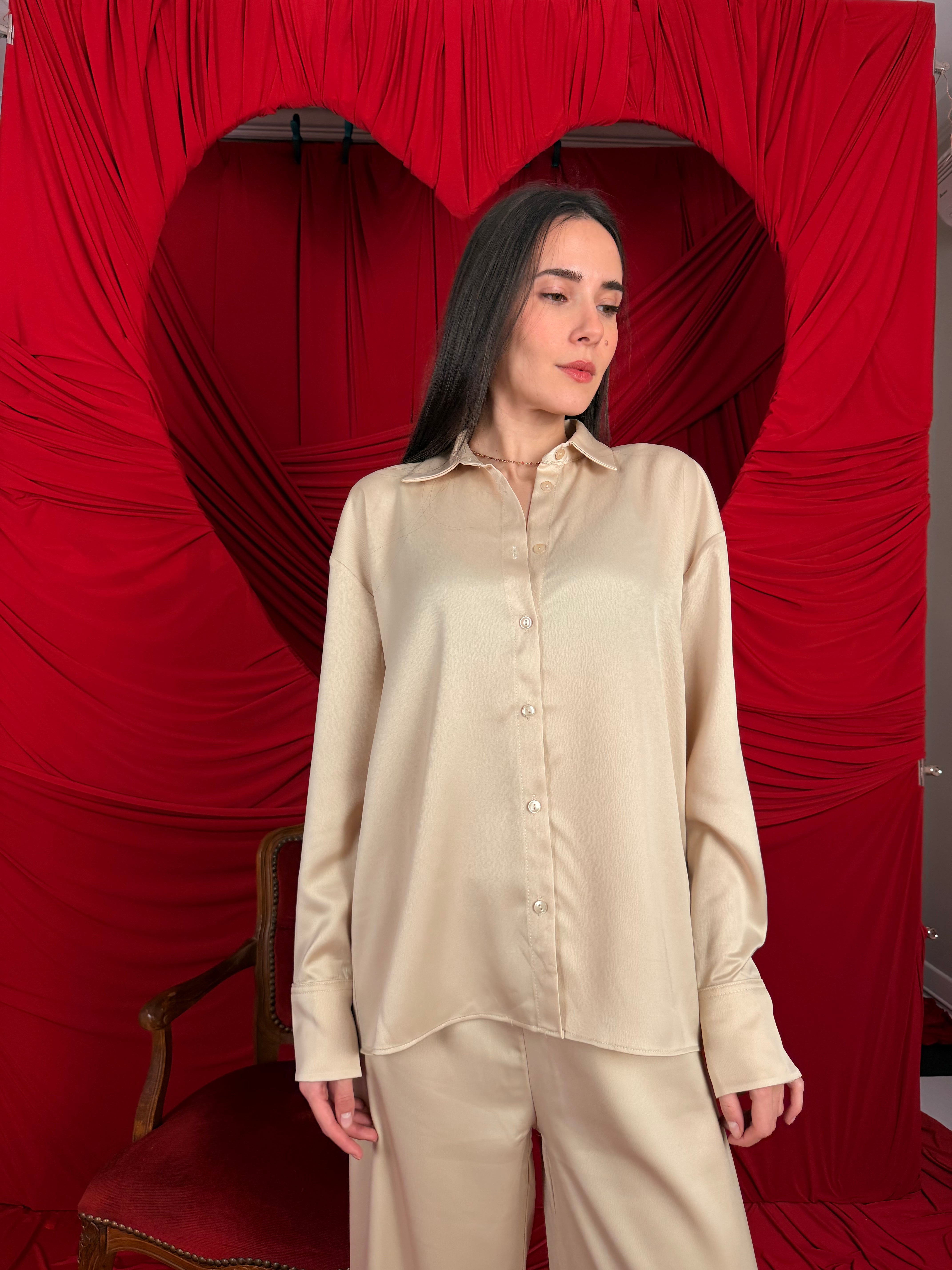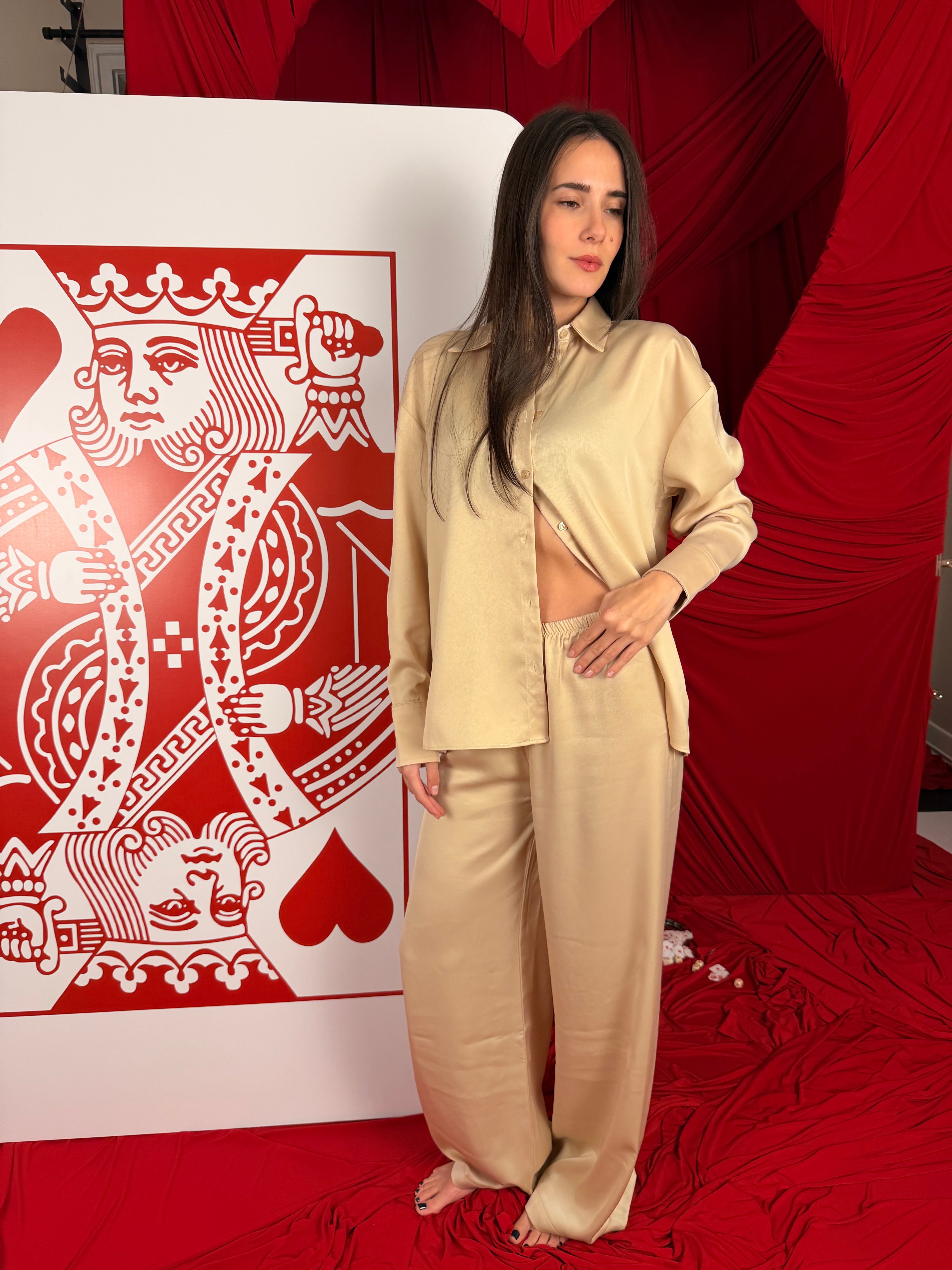 Сет “Lumière Sable” – сатенен сет от риза и панталон в шампанско бежово