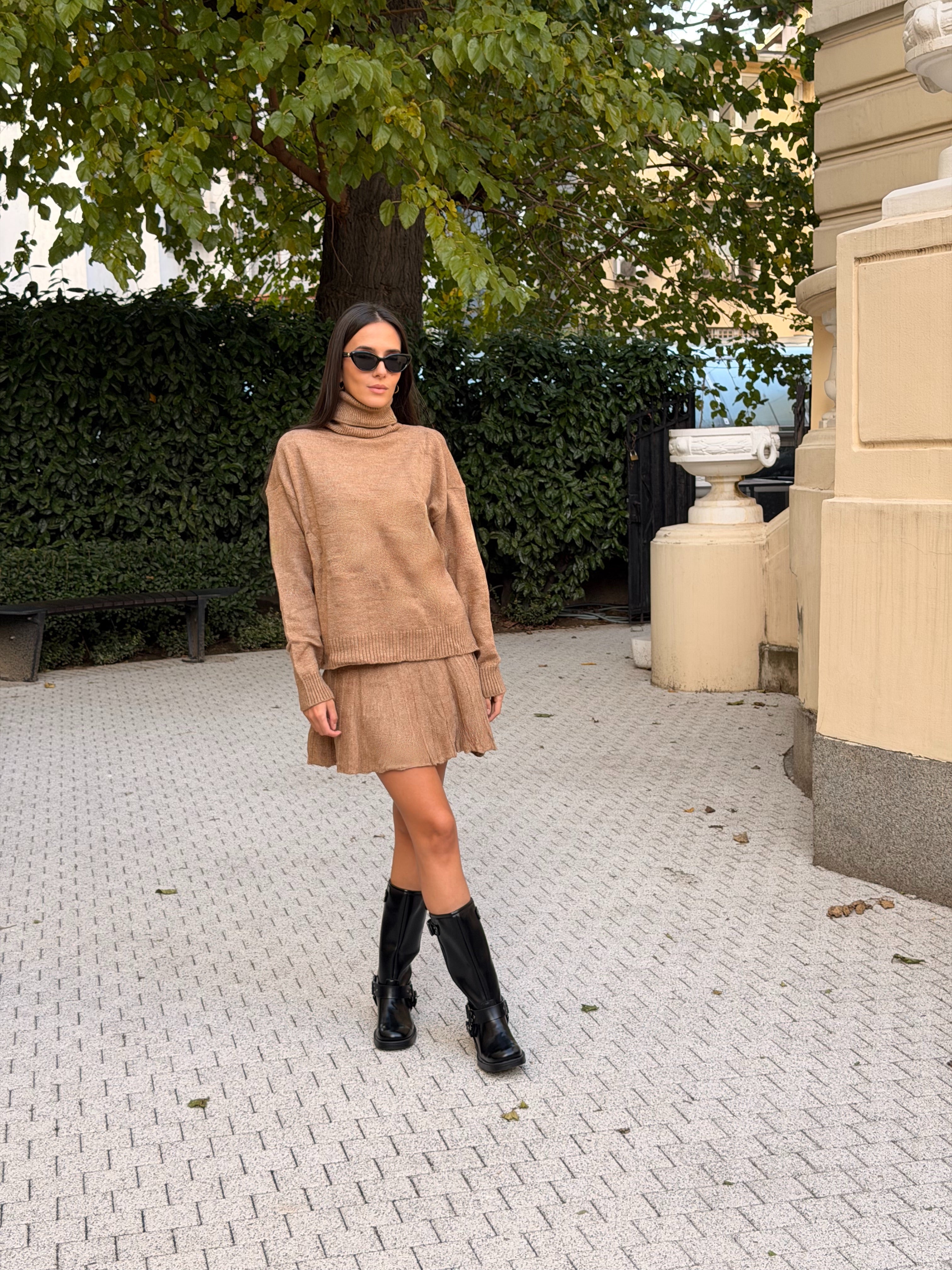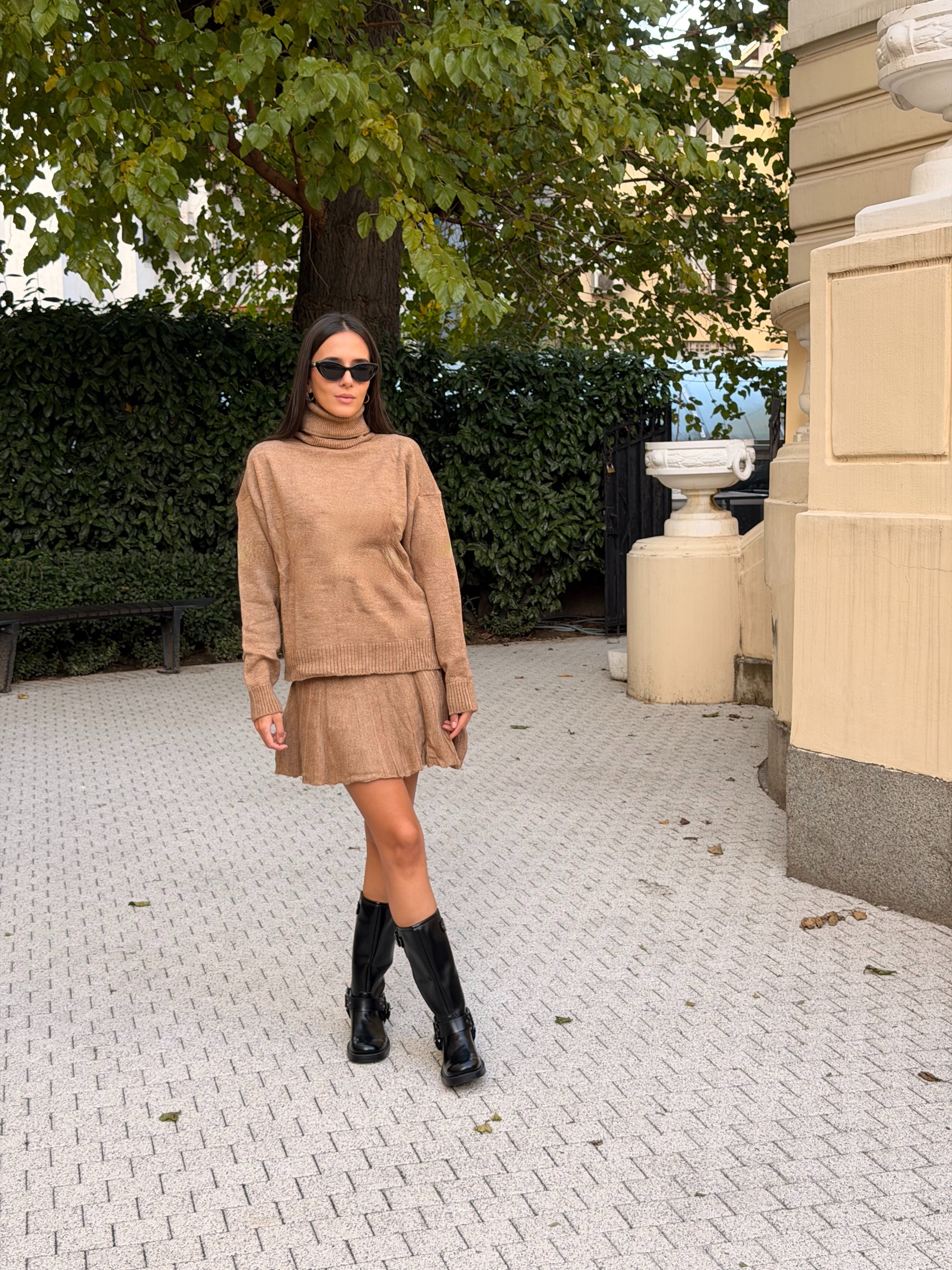 Елегантен комплект от мека плетена материя, съчетаващ свободен пуловер с поло яка и нежна мини пола с лека структура и движение. Моделът впечатлява с минималистичния си дизайн и комфортна кройка, която подчертава женствеността с фин баланс между небрежност и изисканост. Топлият карамелен цвят придава уют и стил, превръщайки го в перфектен избор за есенните дни. Носи го с високи кожени ботуши за модерен градски вид или с маратонки за ежедневен шик.
