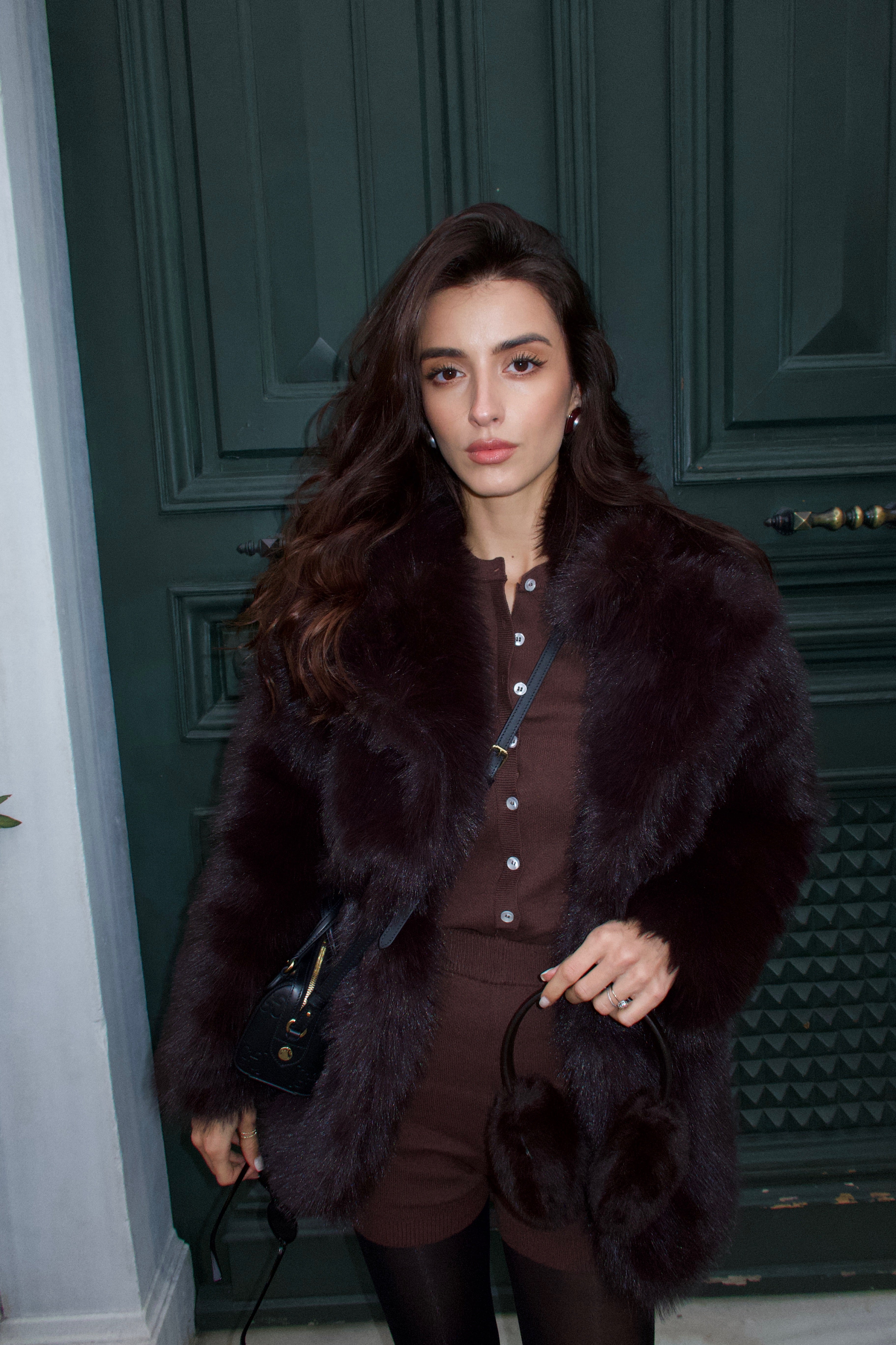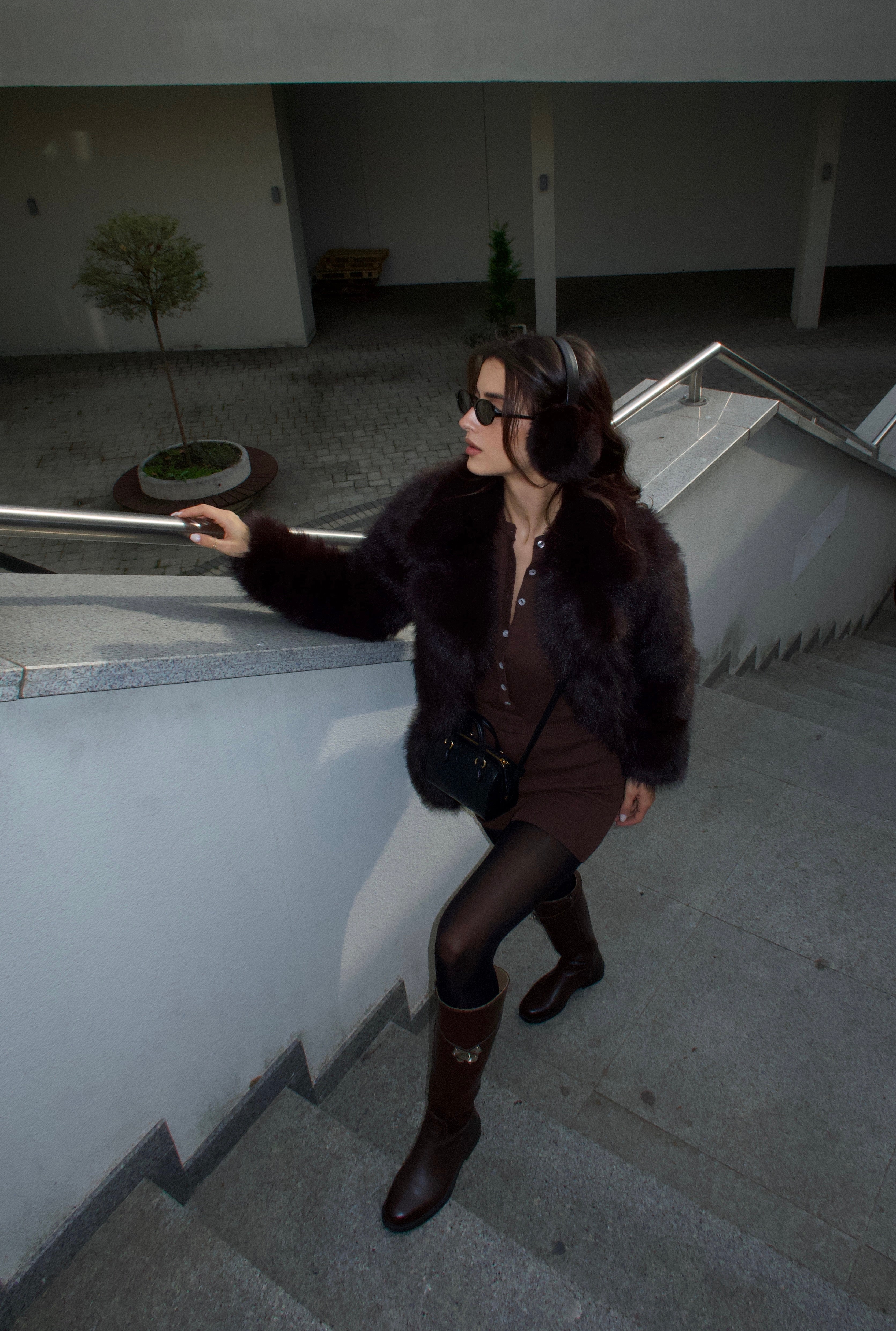 Модерен комплект от две части в топъл шоколадов нюанс – боди с дълъг ръкав и копчета отпред, комбинирано с къси плетени панталонки с ластична талия. Материята е мека и еластична, което го прави едновременно удобен и подчертаващ силуета. Идеален за небрежен градски стил с боти или маратонки, но и достатъчно елегантен за комбинация с палто или сако и токчета.