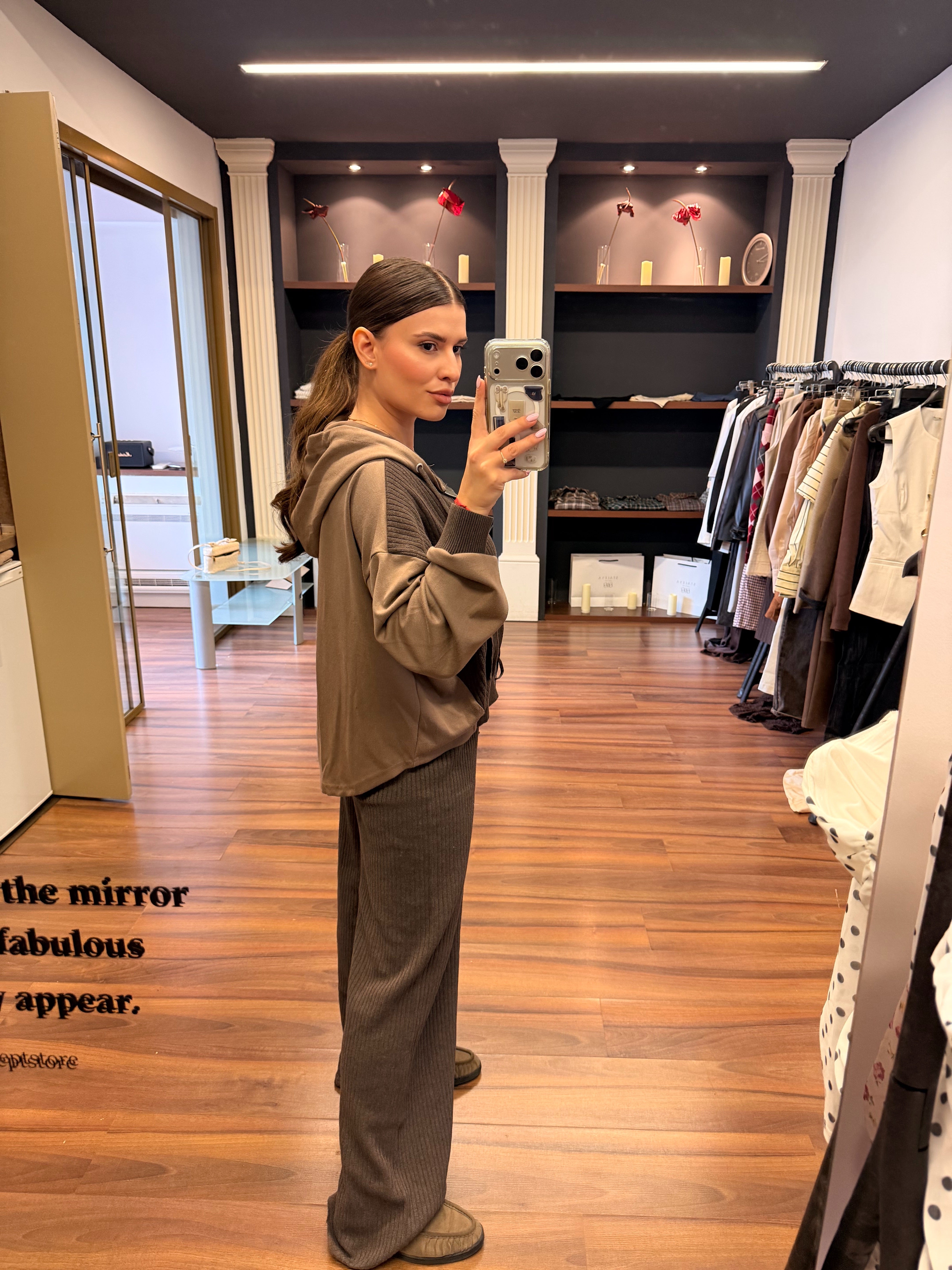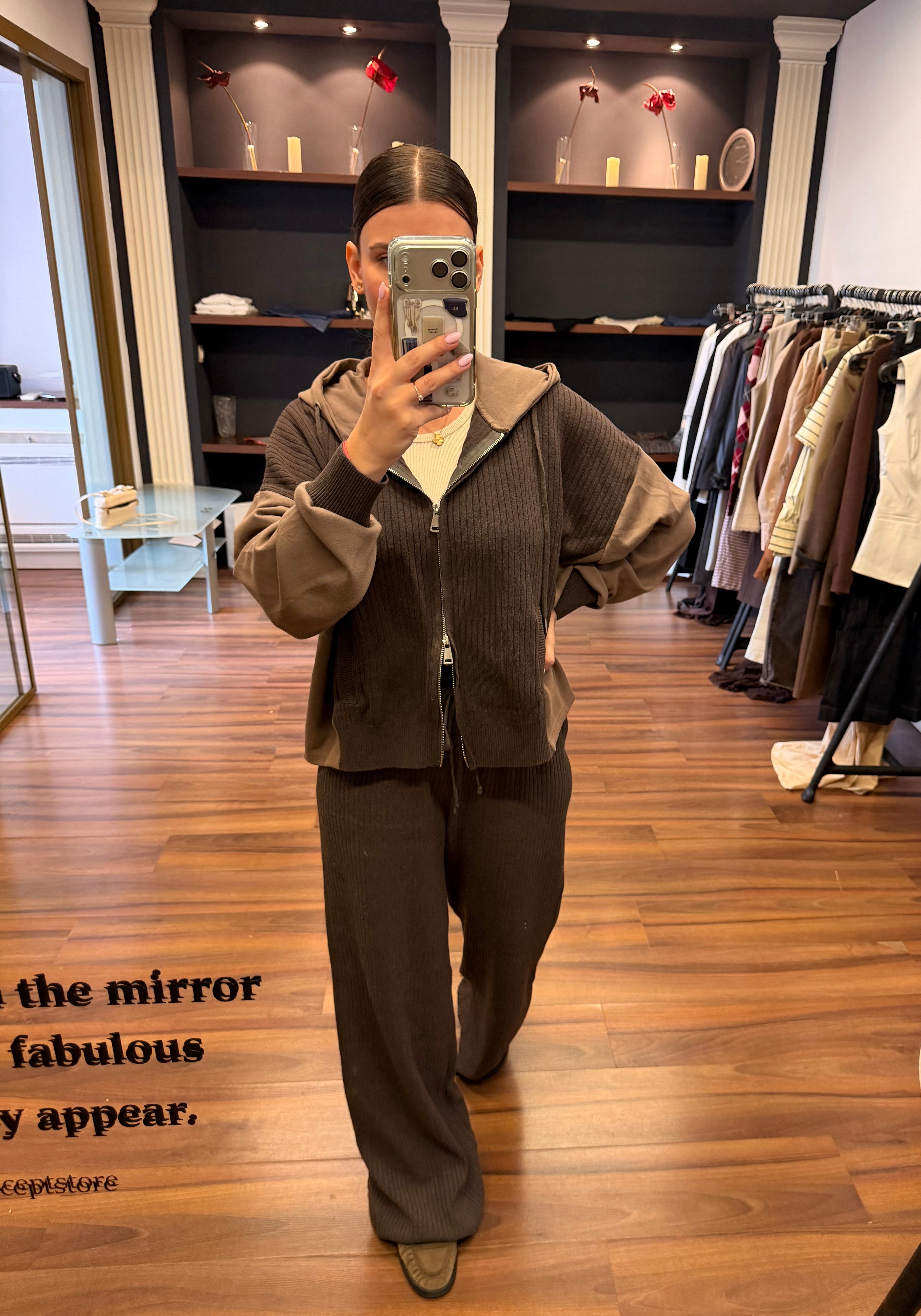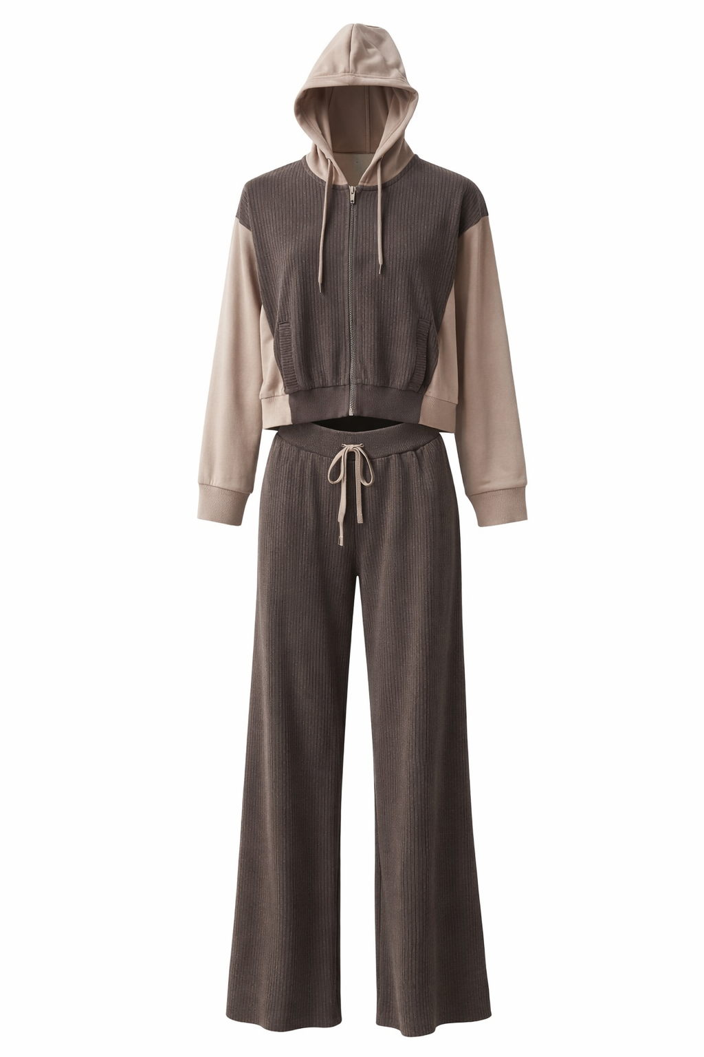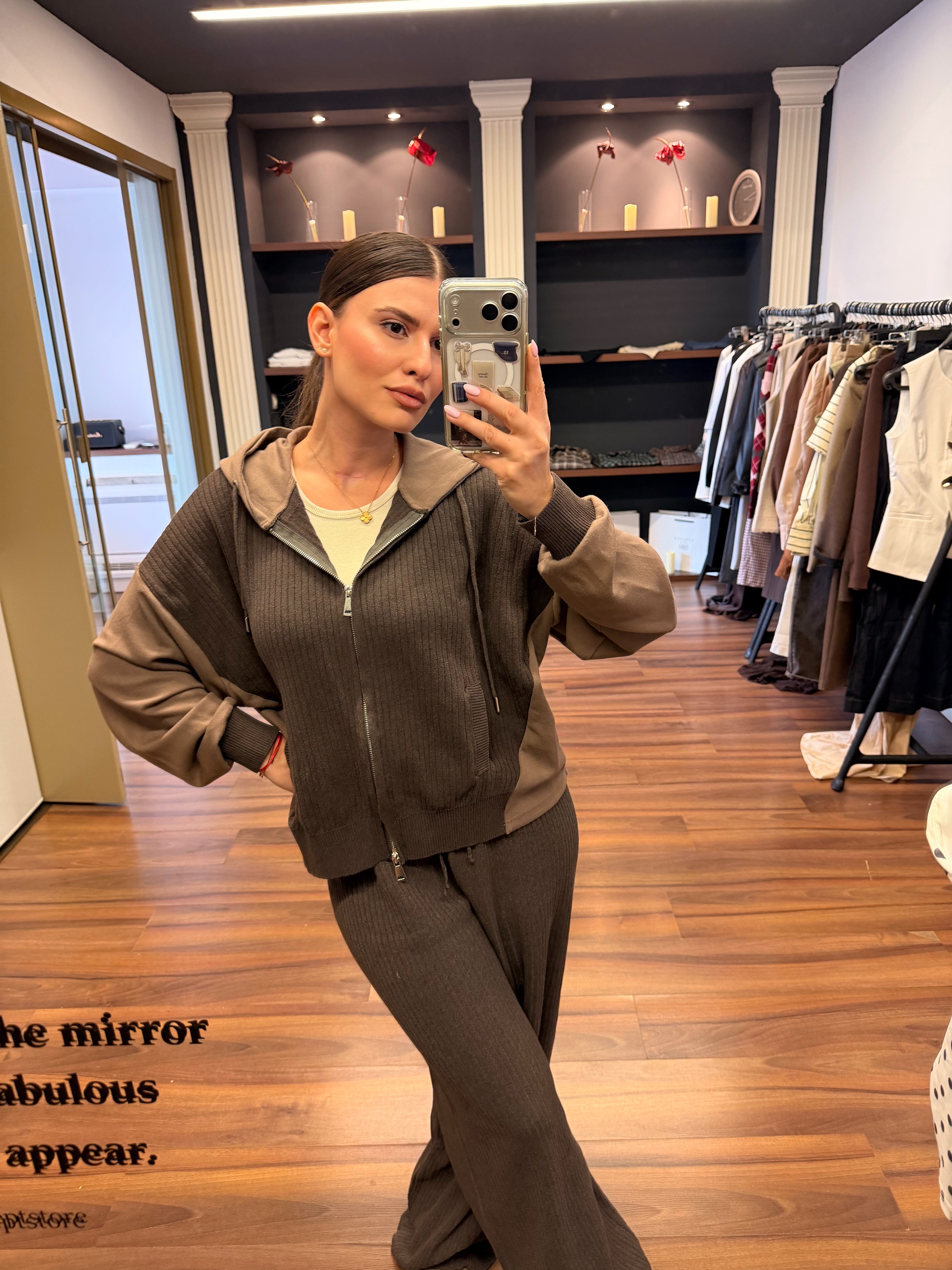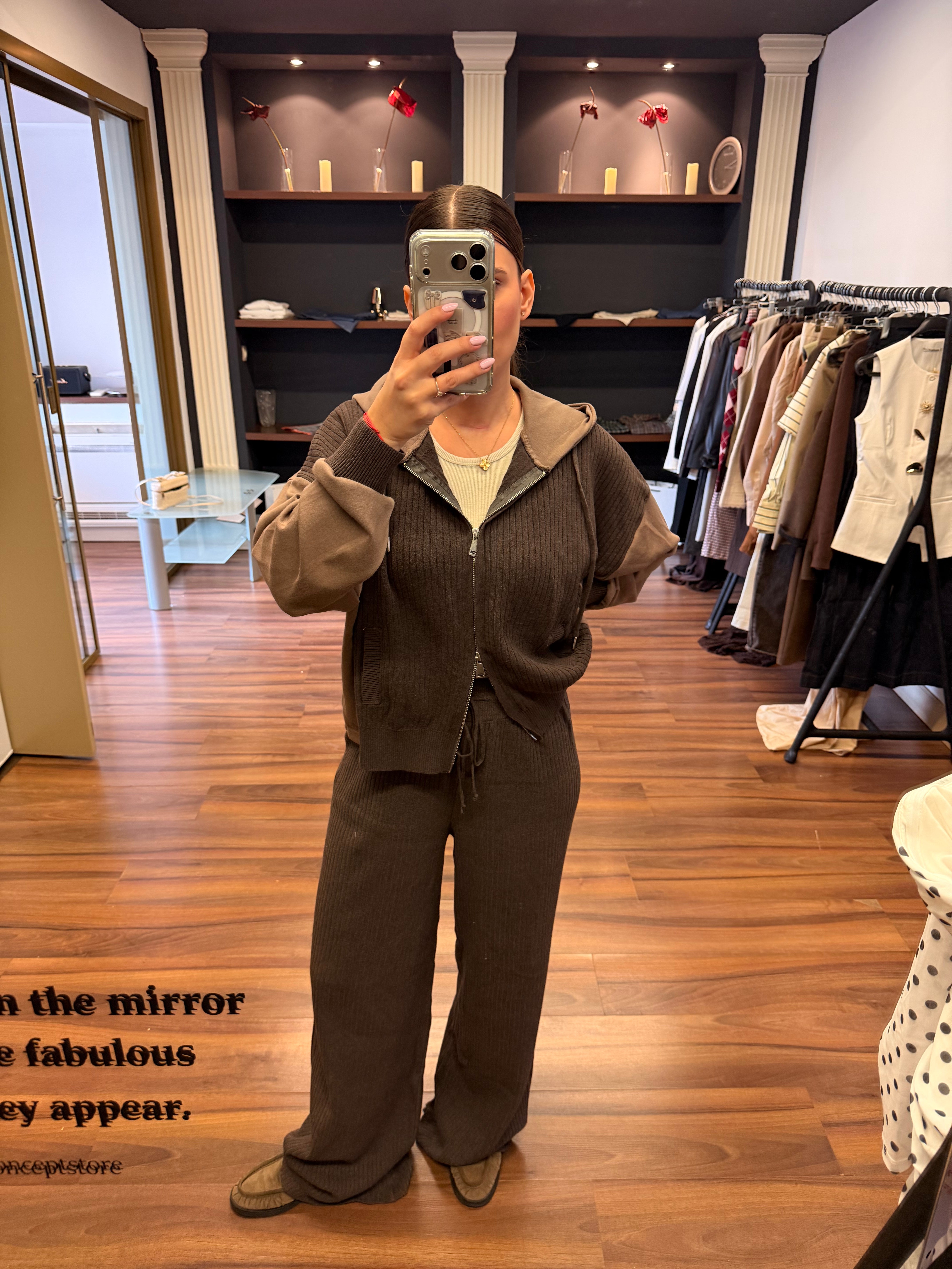 Café Lounge е сет, създаден за комфорт и модерна ежедневна елегантност. Топлите нюанси на кафе и бежово създават стилен контраст, който изглежда едновременно уютно, минималистично и изключително актуално.