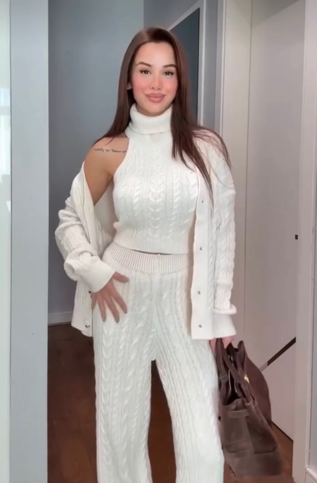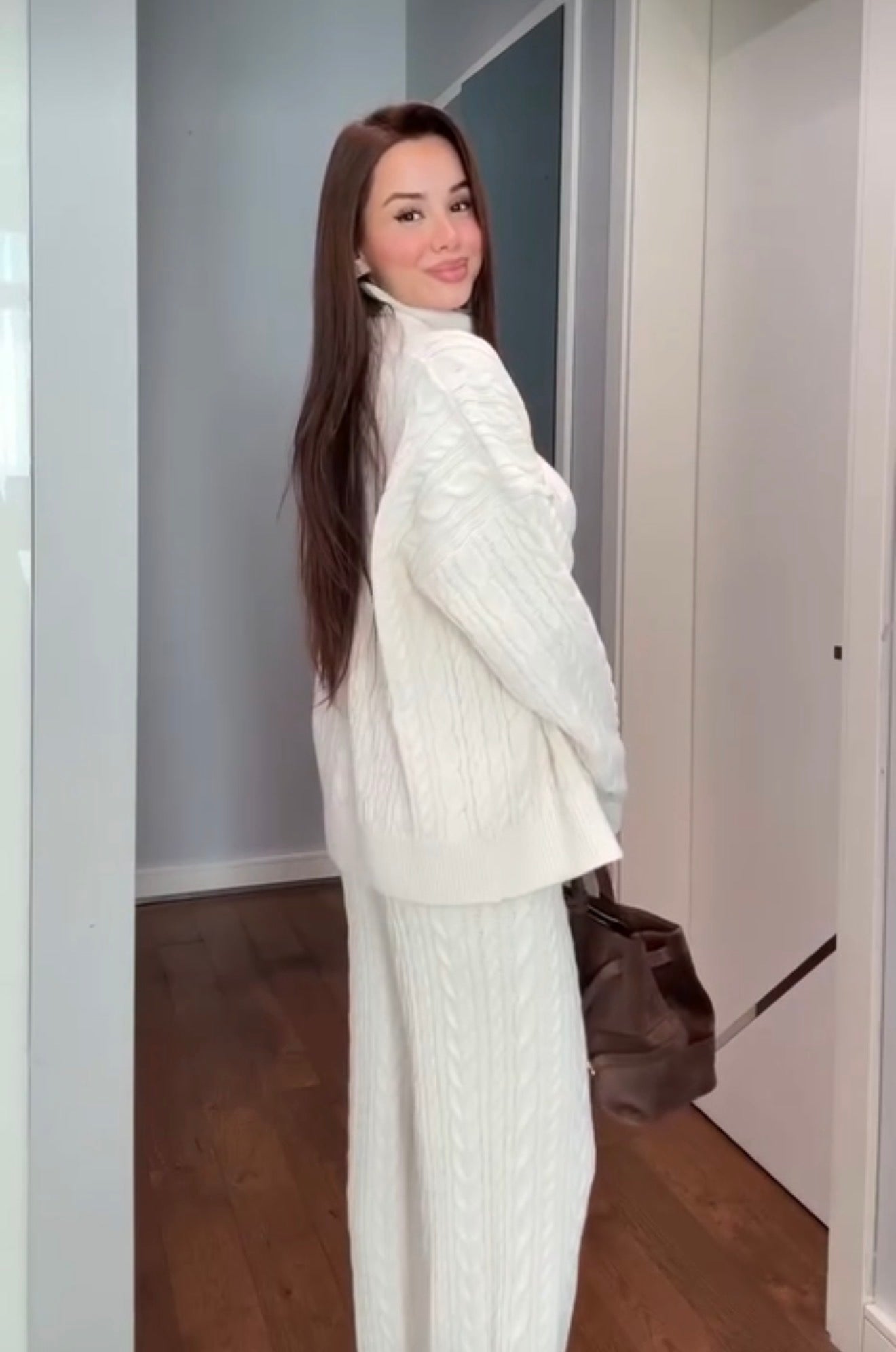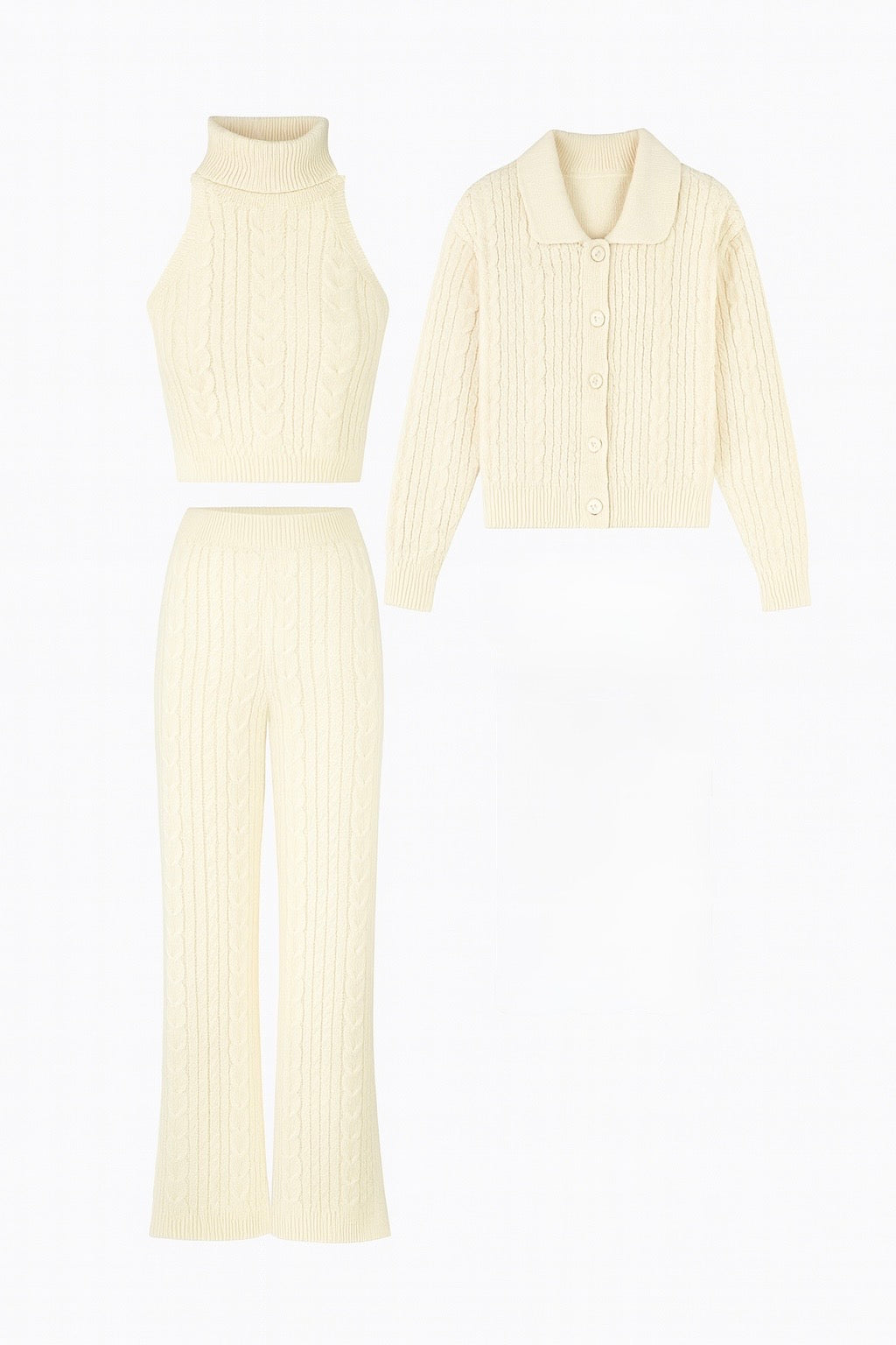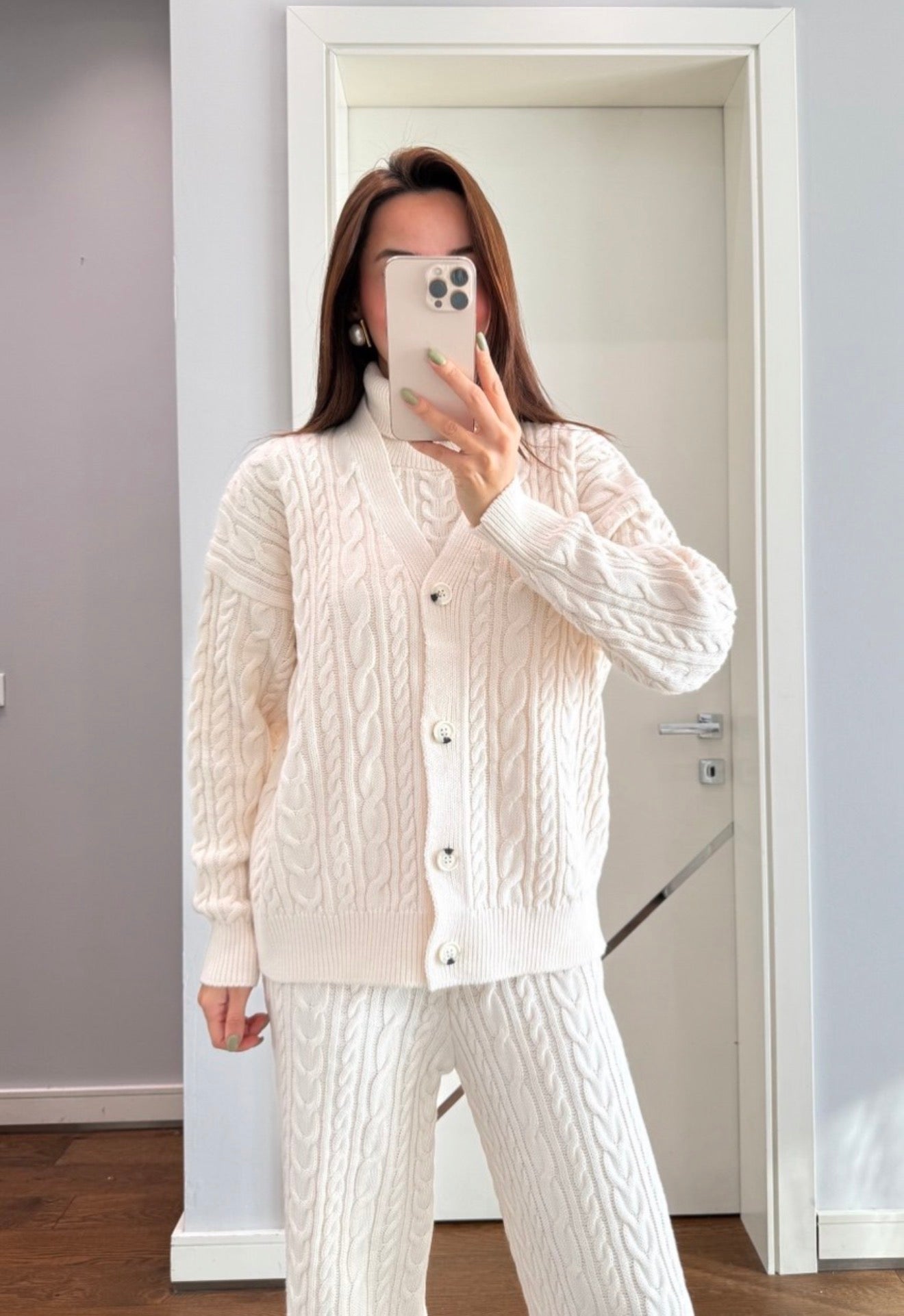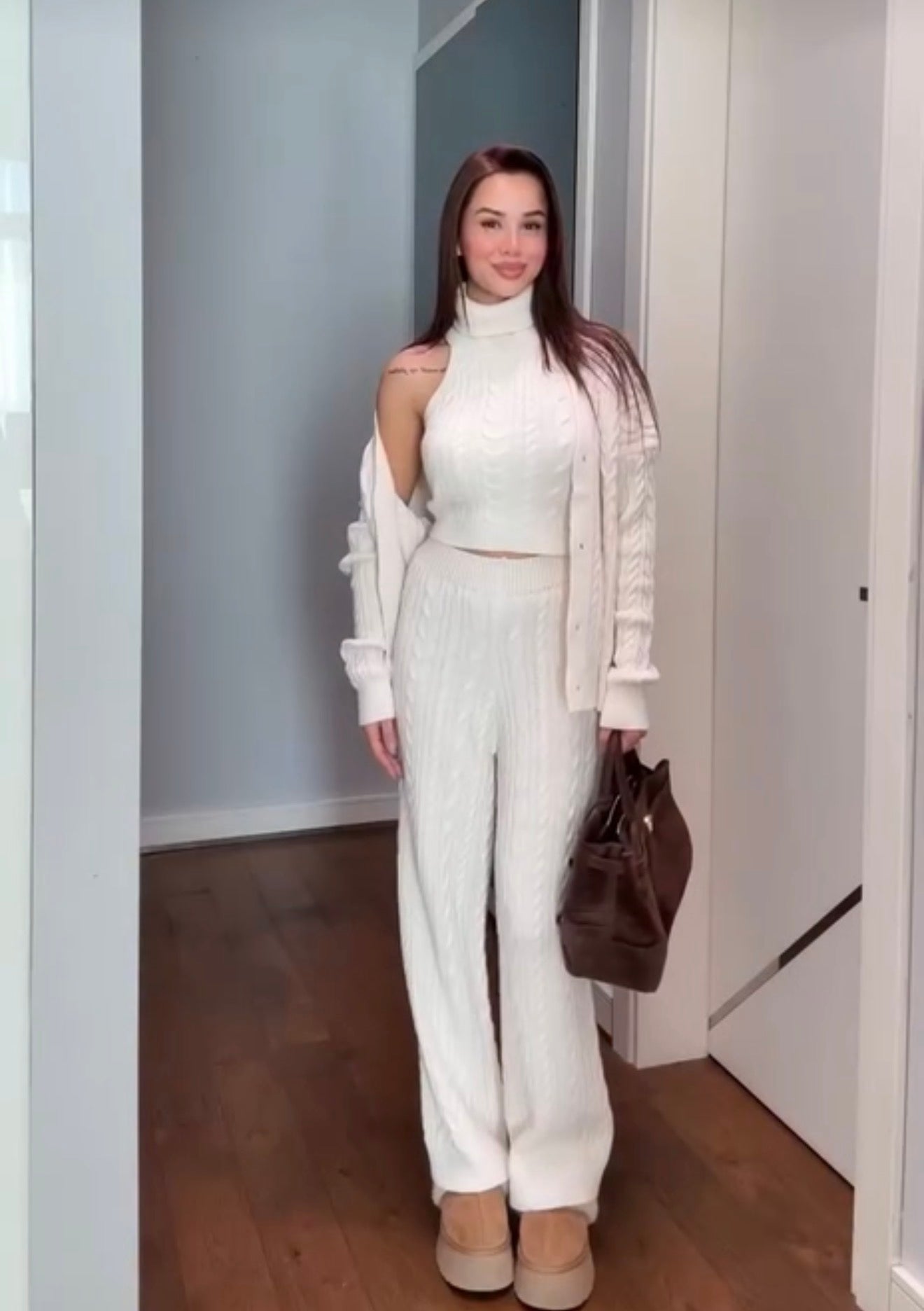 Потопи се в уюта и изискаността на Crème Élégance – трико сет, който съчетава топлина, комфорт и безупречен стил. Създаден от висок клас плетиво със състав 70% вълна и 30% акрил, този комплект в цвят топло млечно бяло се състои от: