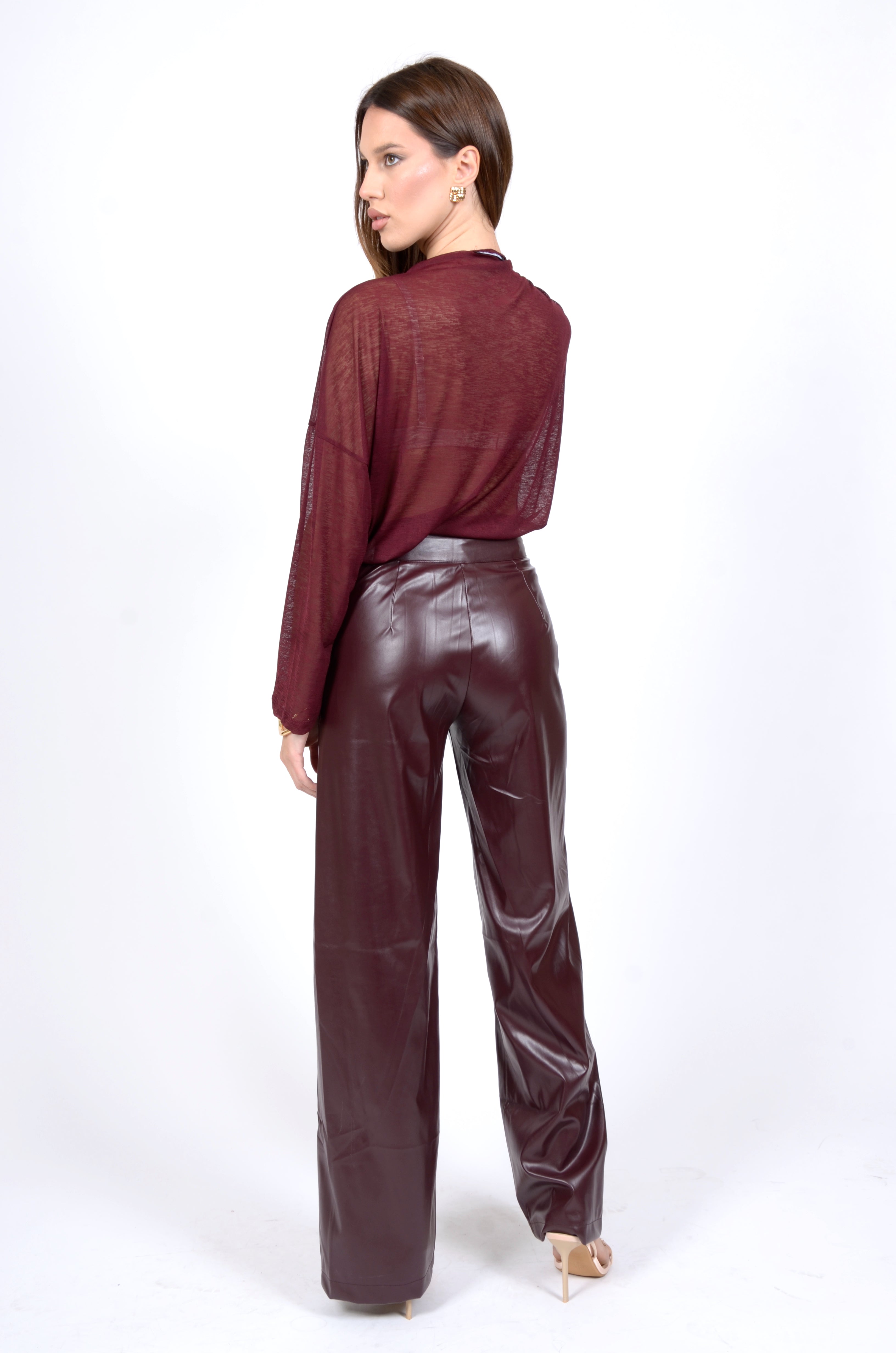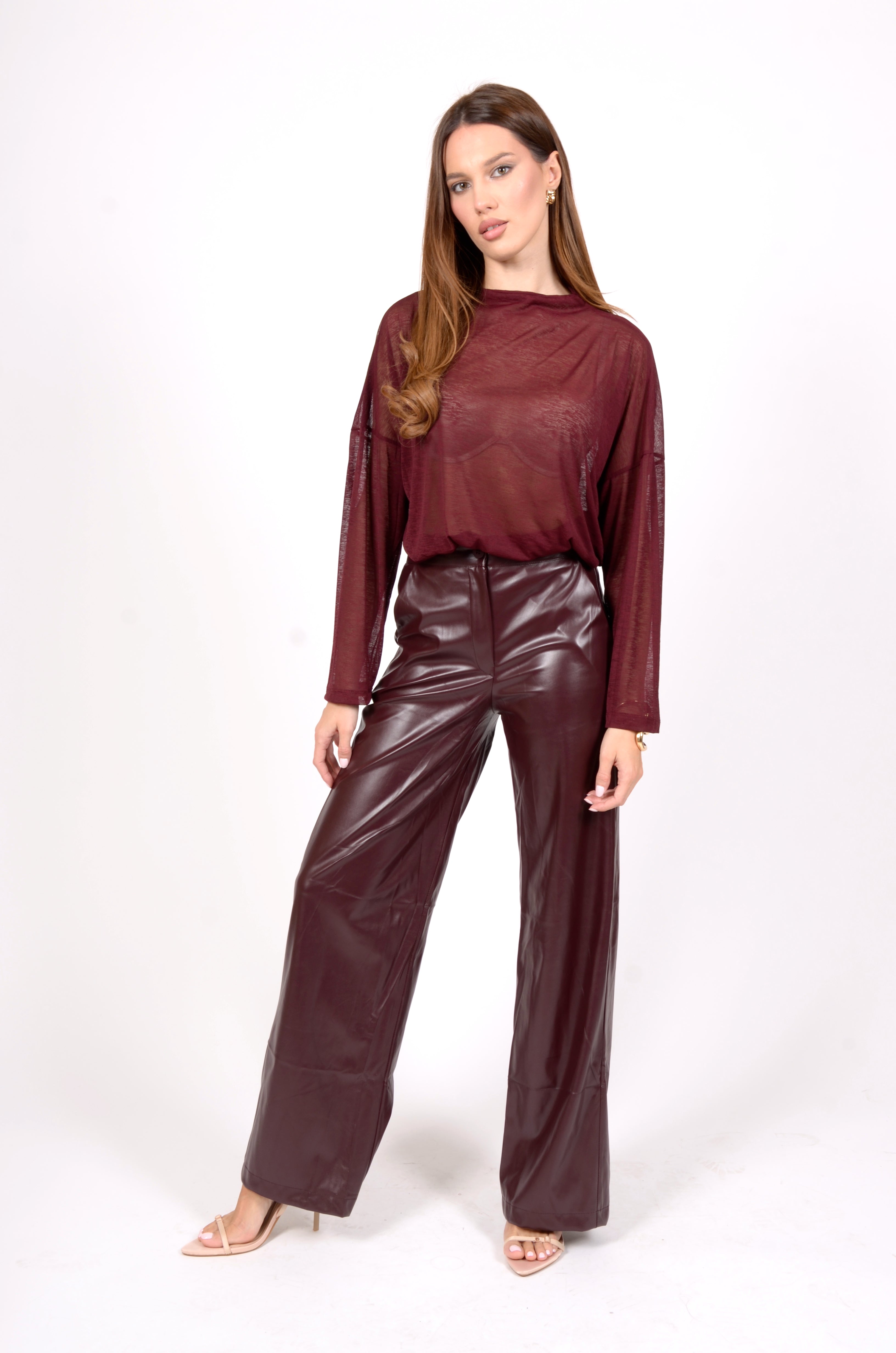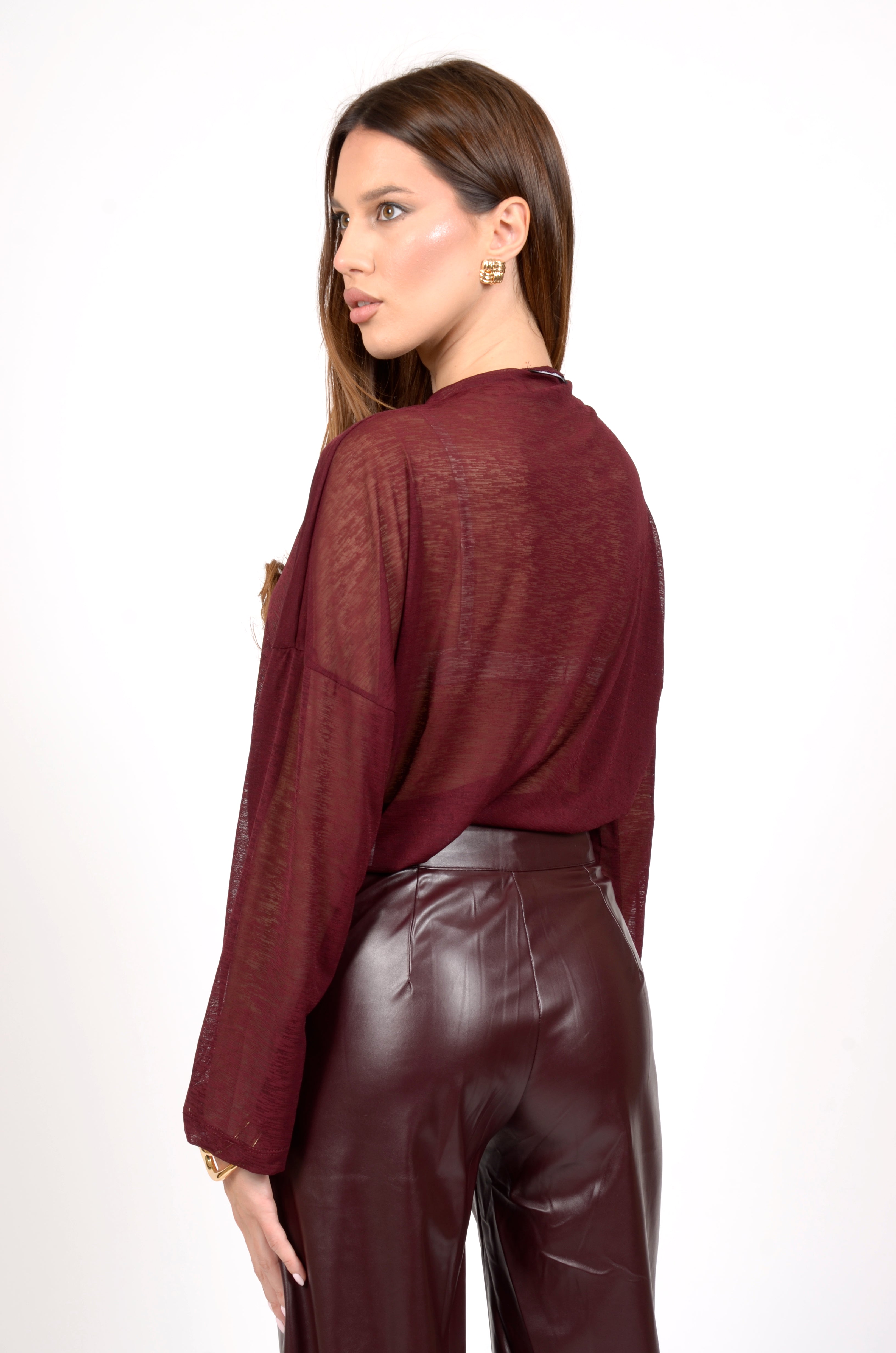 Лек и ефирен топ с дълъг ръкав в цвят бордо. Материята е деликатно прозрачна, което придава чувственост и модерно излъчване. Свободната кройка и фината текстура го правят удобен и универсален – идеален за комбинация с кожен панталон, дънки или пола. Подходящ както за ежедневен, така и за вечерен стил.