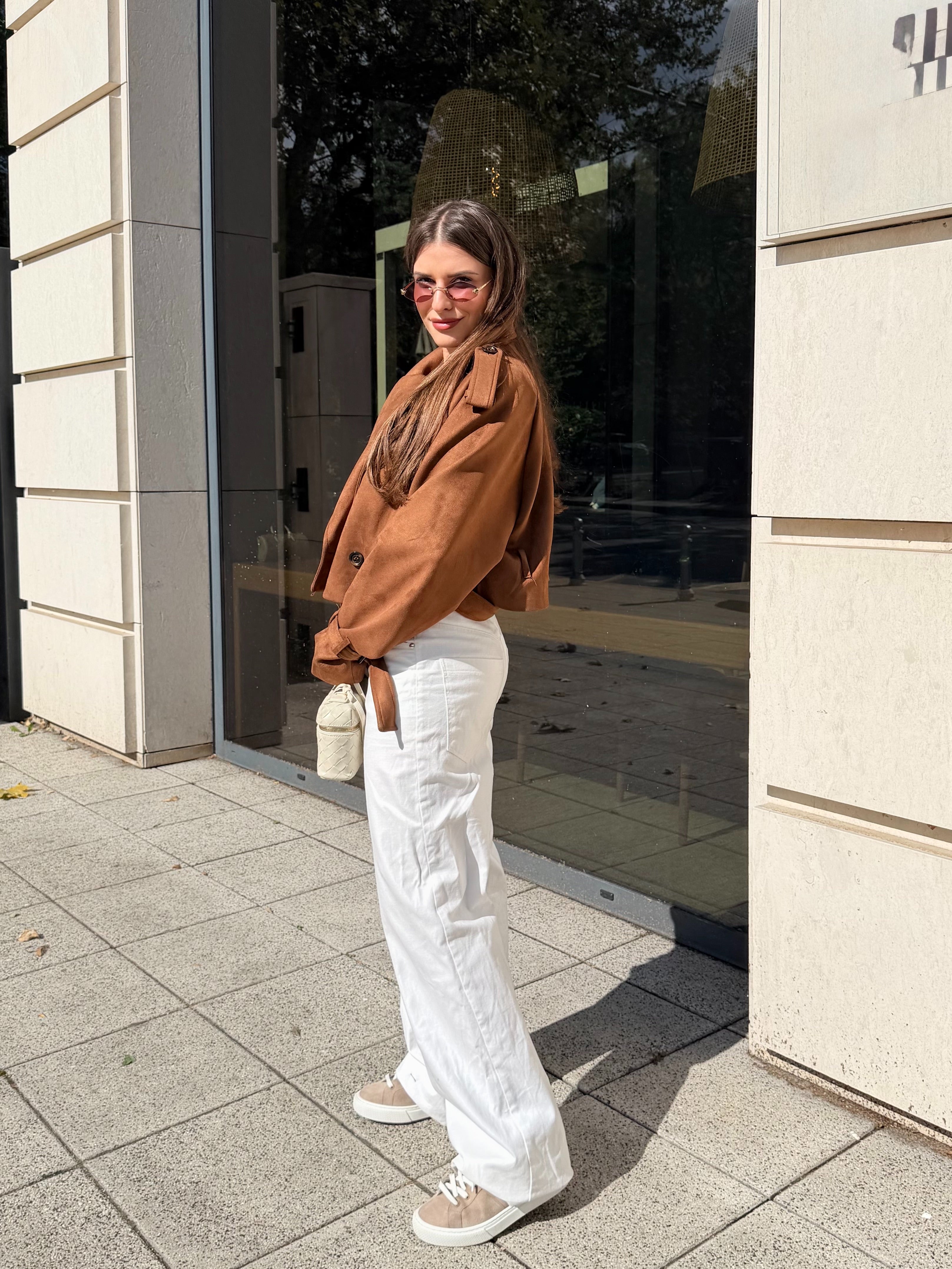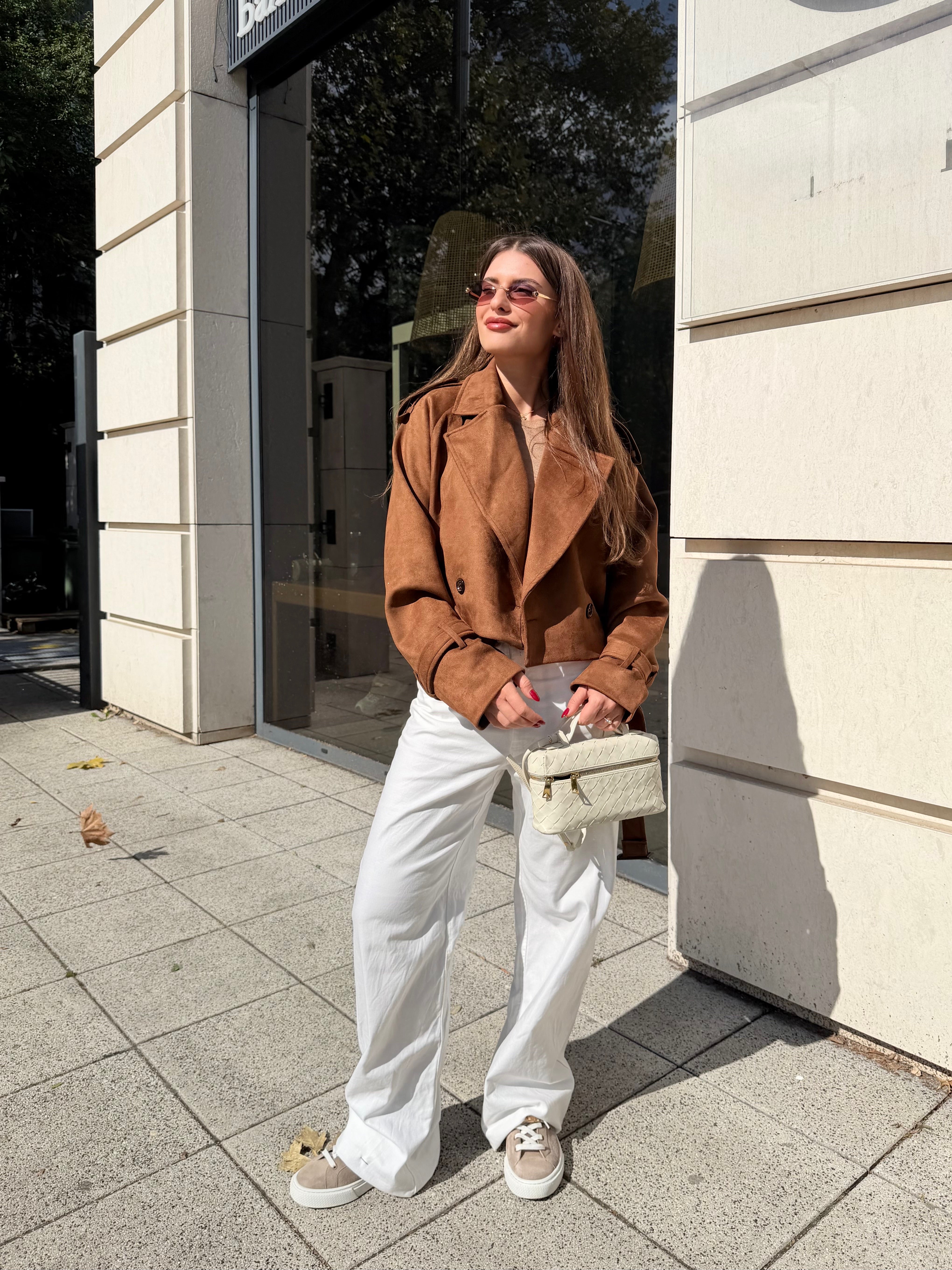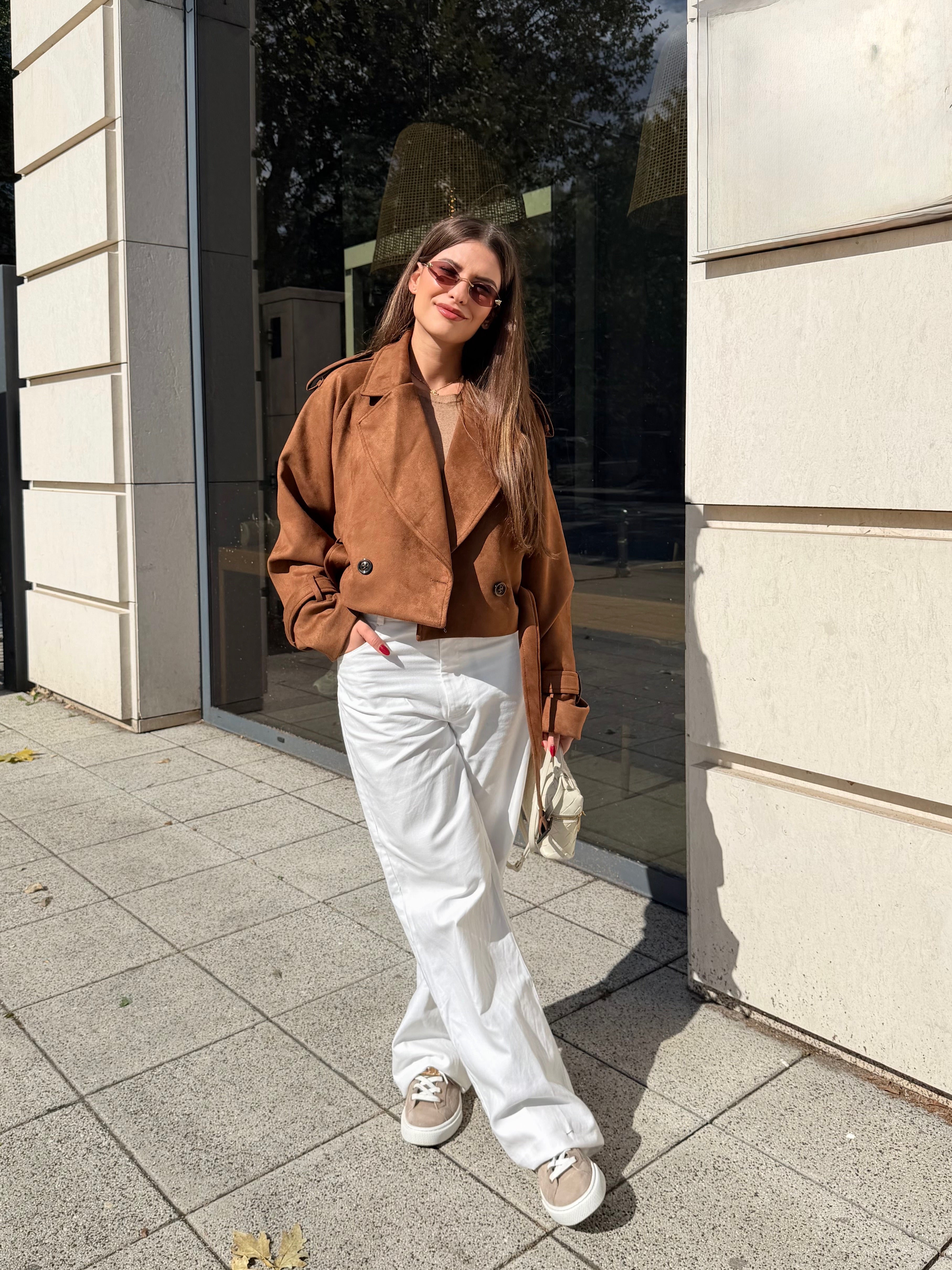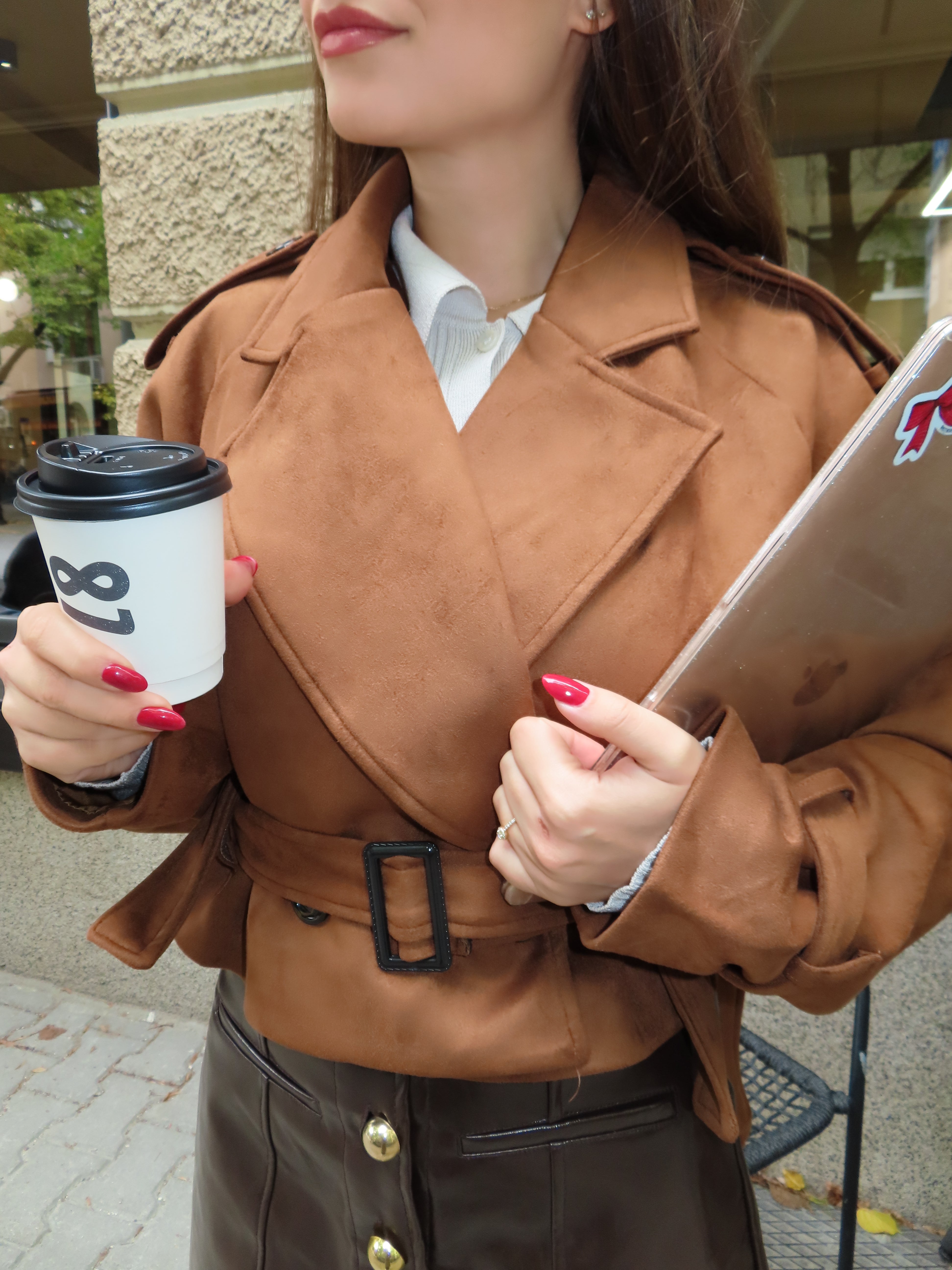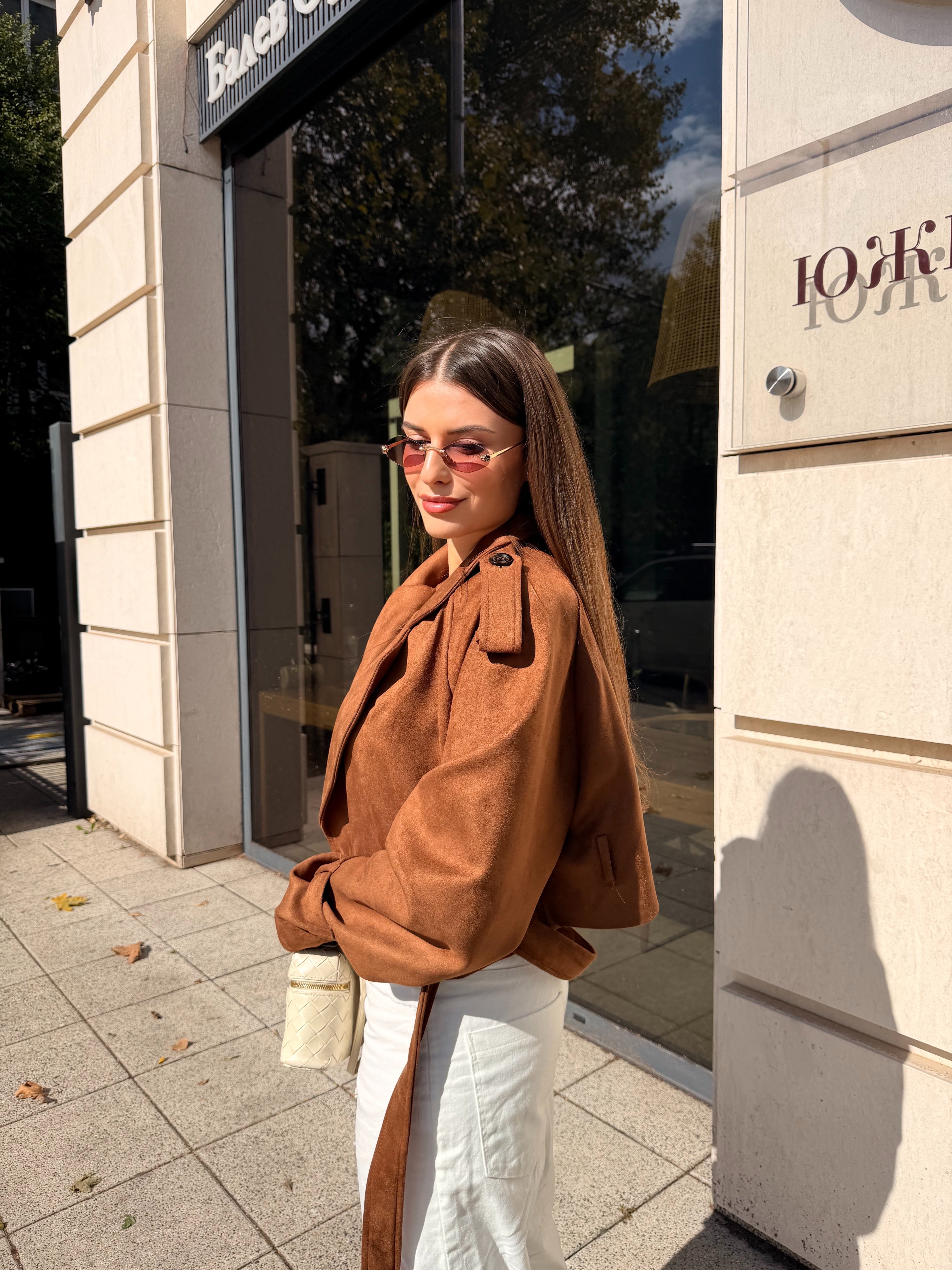 Опресняване на наличносттаТова късо палто от мек еко велур е създадено за жената, която иска да изглежда безупречно дори в най-забързаните градски дни. Силуетът с колан подчертава талията и придава елегантна структура, докато наситеният карамелен нюанс носи топлина и стил. Детайлите по раменете и двуредното закопчаване добавят леко ретро усещане с модерен акцент.