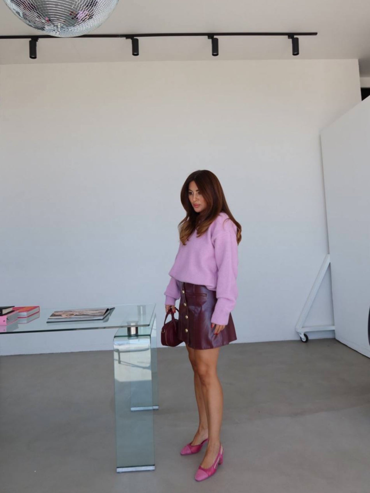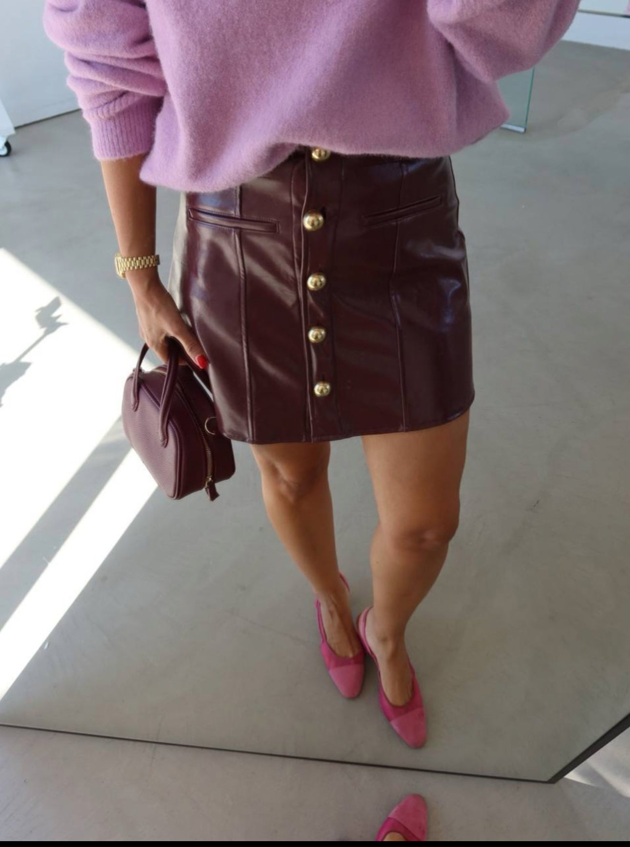 Красива пола от изкуствена кожа в бордо със златни копчета и декоративни джобове. Идеалният избор за есенна шик визия, с която да заблестиш. Цветът е супер тренди, а кройката отива както и на семпъл топ за ежедневна визия, така и на някой по-смел прозрачен топ за вечерна секси визия. Комбинирай с любимите си боти или ботуши и събери всички погледи!