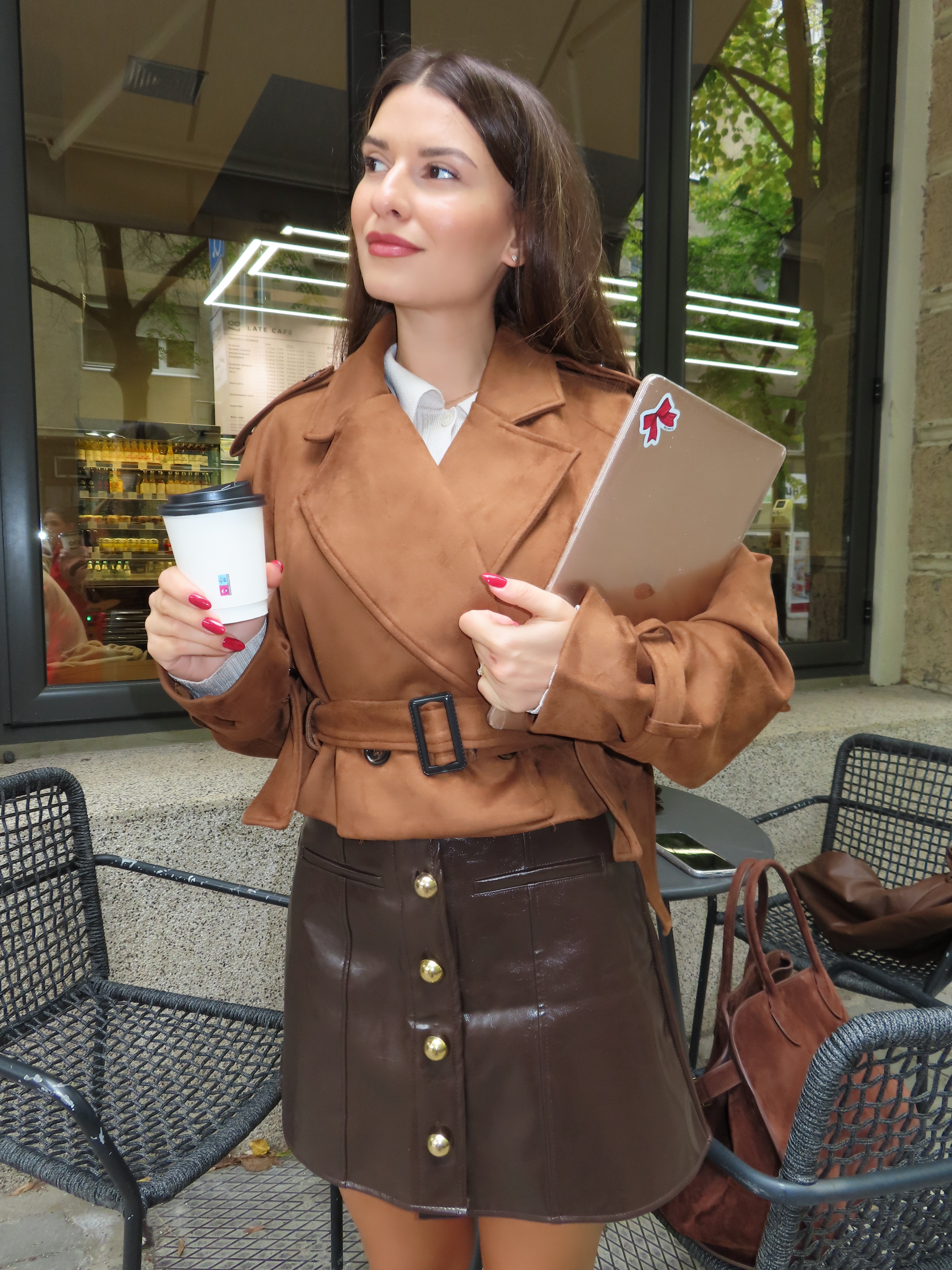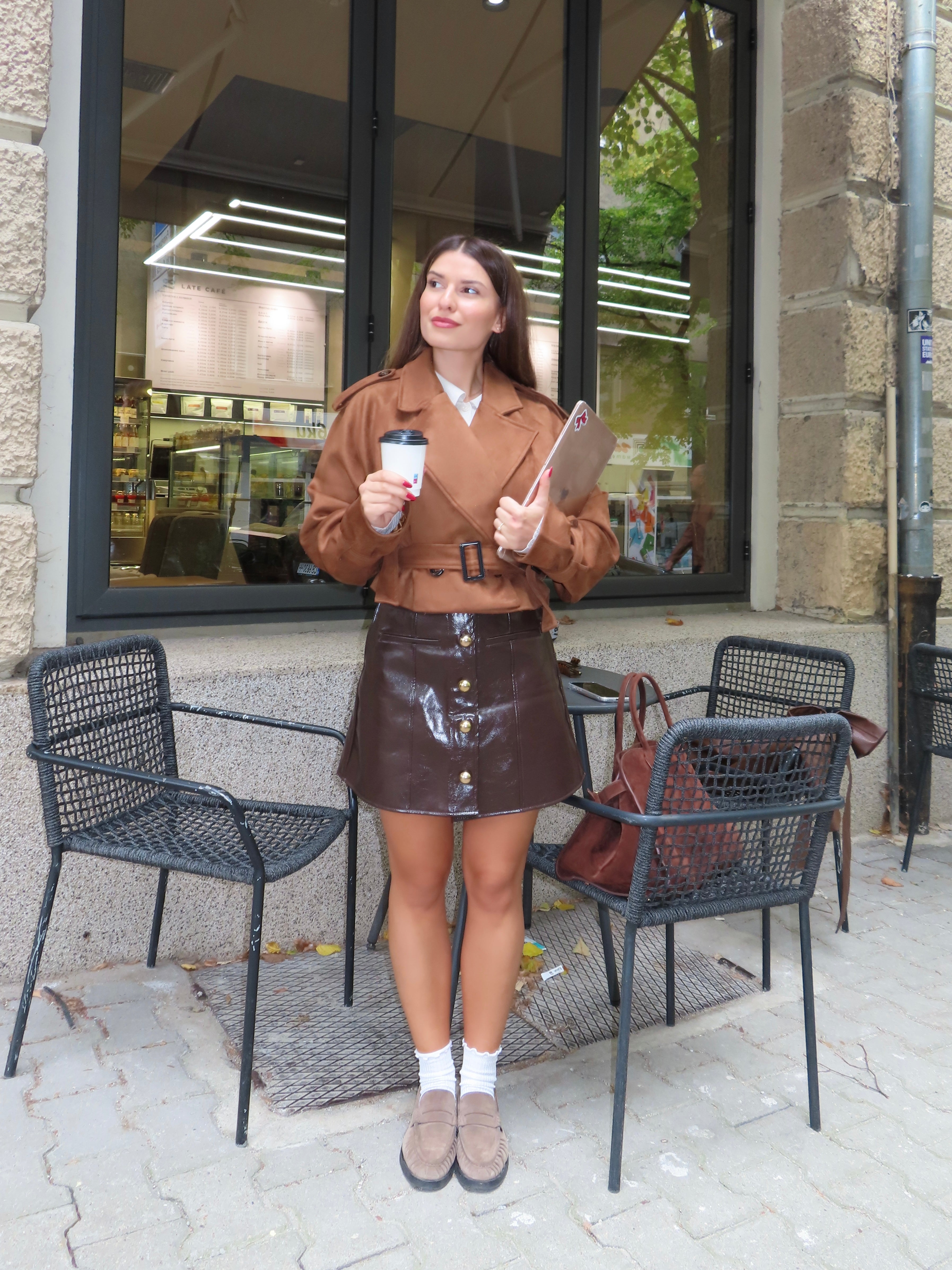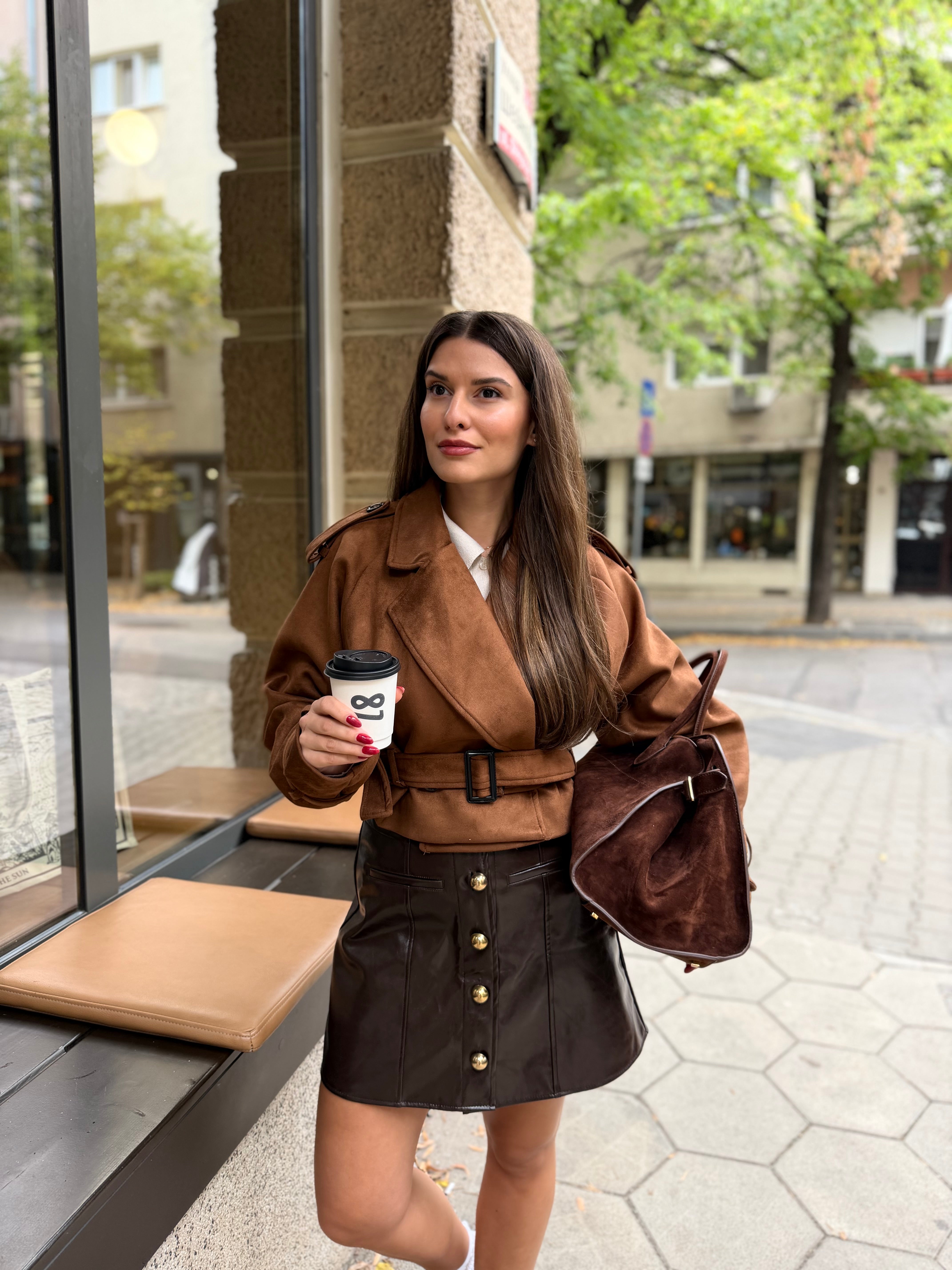 Опресняване на наличносттаКрасива пола от изкуствена кожа в кафяво със златни копчета и декоративни джобове. Идеалният избор за есенна шик визия, с която да заблестиш. Цветът е супер тренди, а кройката отива както и на семпъл топ за ежедневна визия, така и на някой по-смел прозрачен топ за вечерна секси визия. Комбинирай с любимите си боти или ботуши и събери всички погледи!